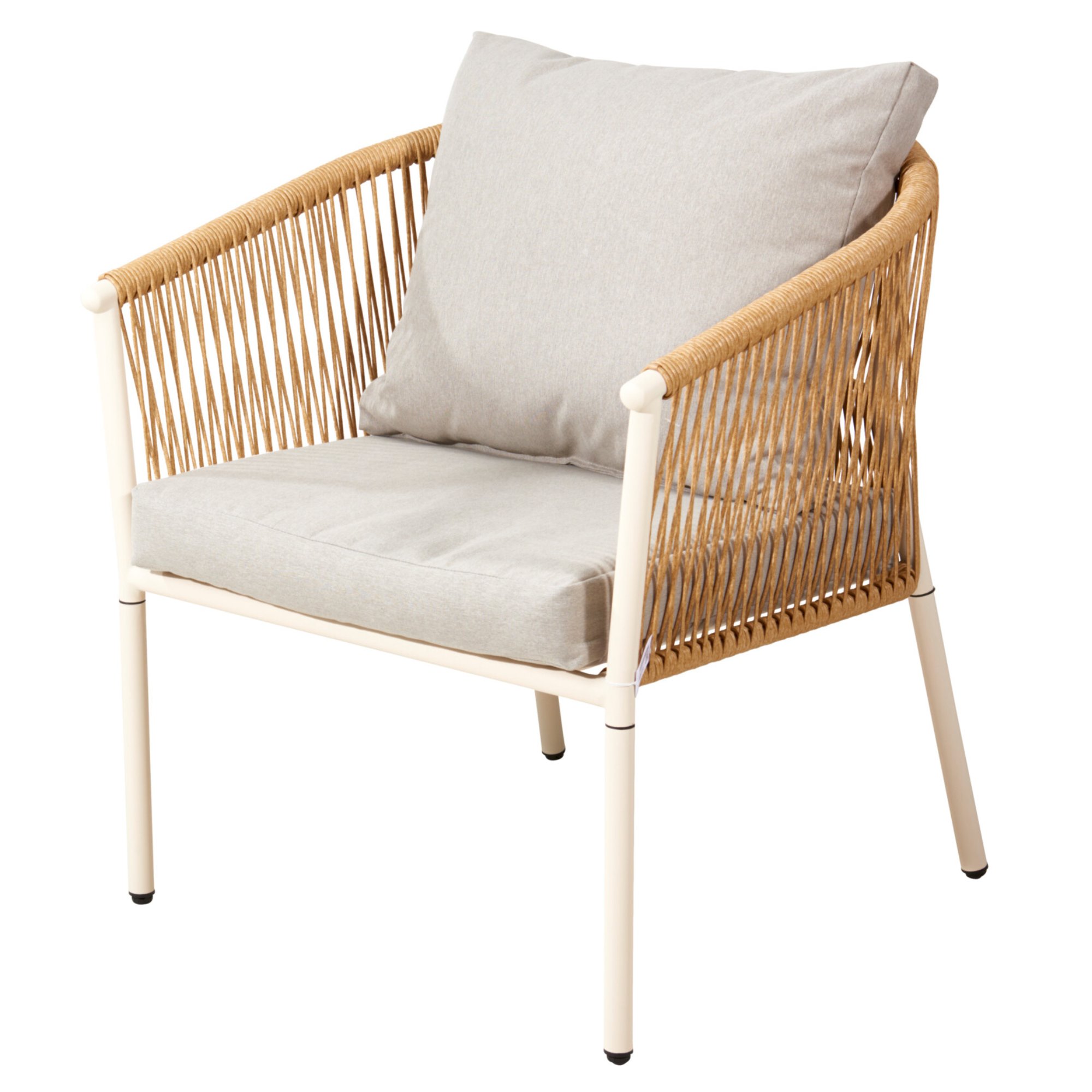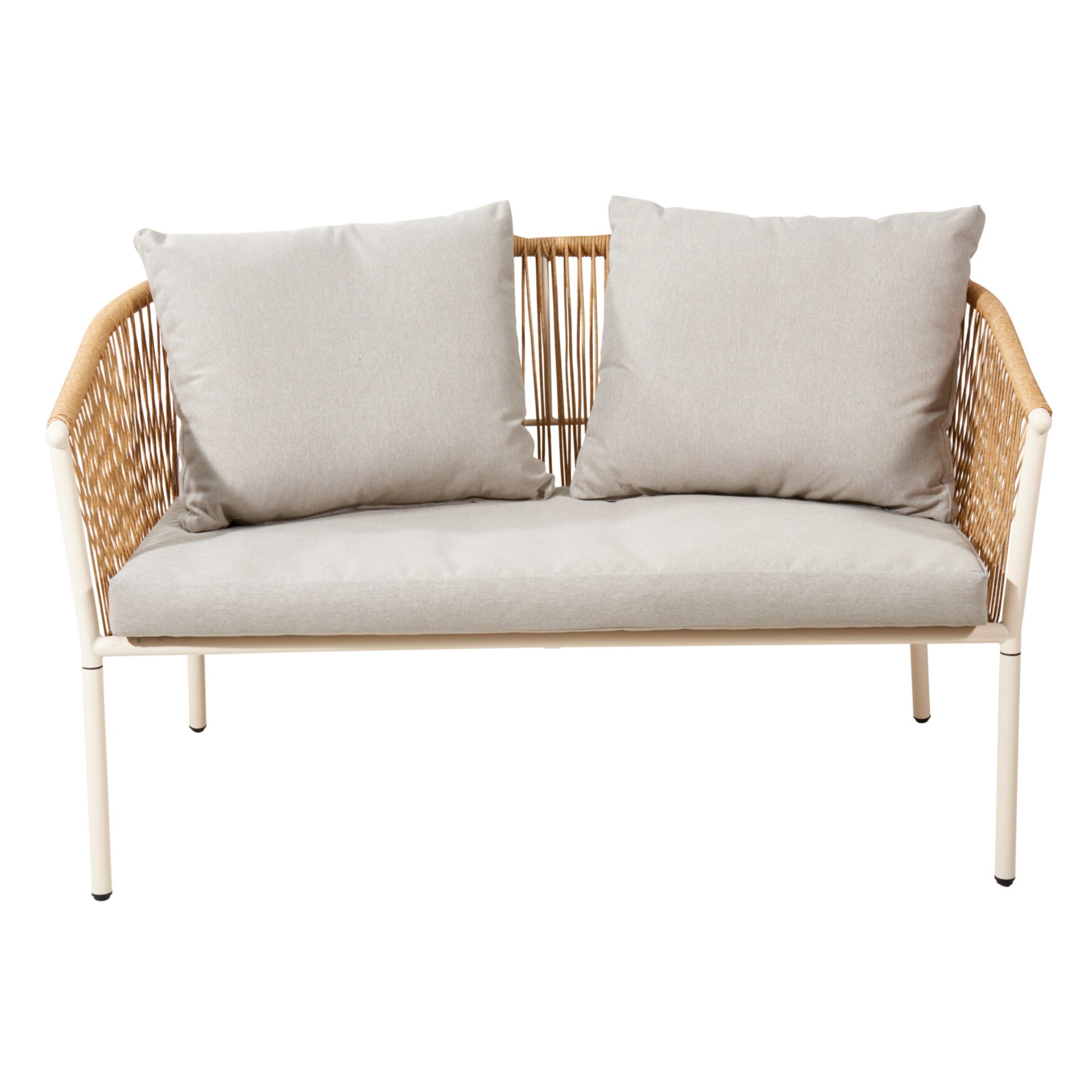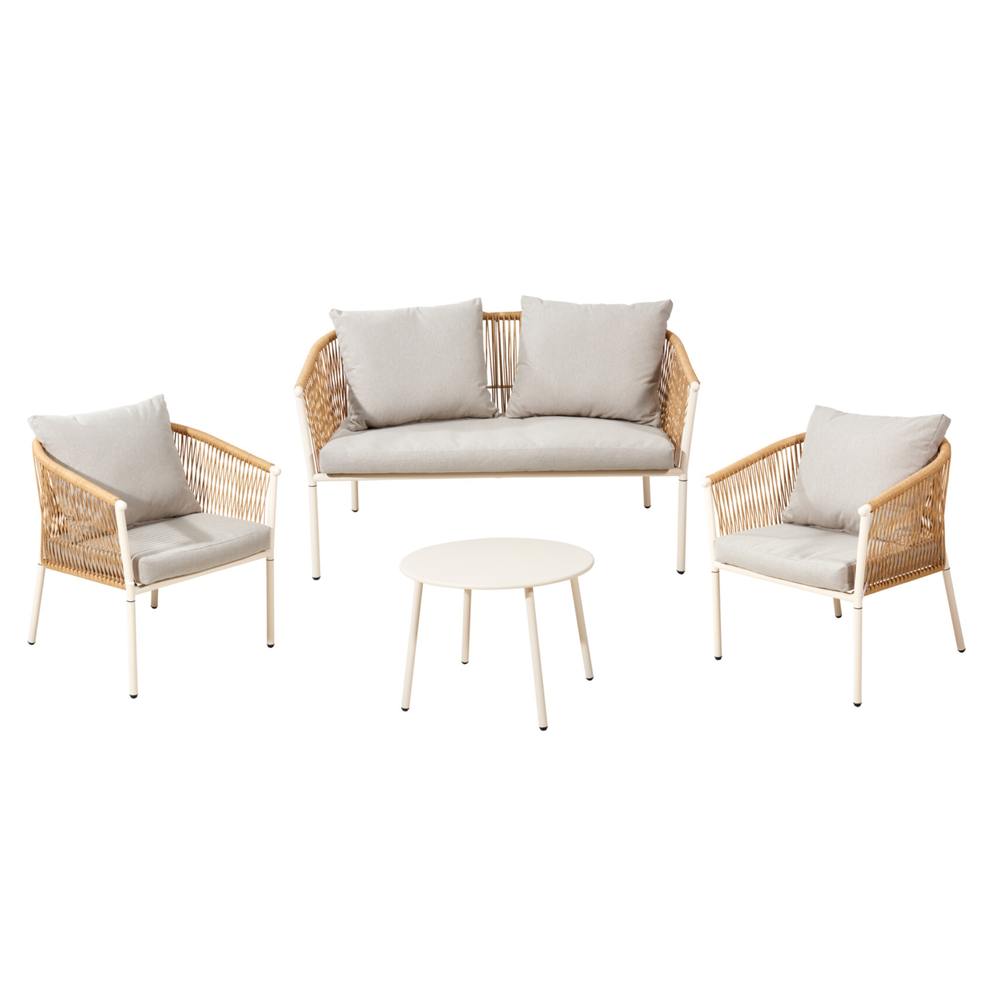 Součástí tohoto 4dílného setu jsou 2 křesla, 1 pohovka a 1 stolek. Pevná a stabilní konstrukce tohoto nábytku je vyrobena z ocele a její povrch je pozinkovaný s práškovým nástřikem. Konstrukce je opletena syntetickým ratanem. Součástí balení jsou i sedáky a polštáře.