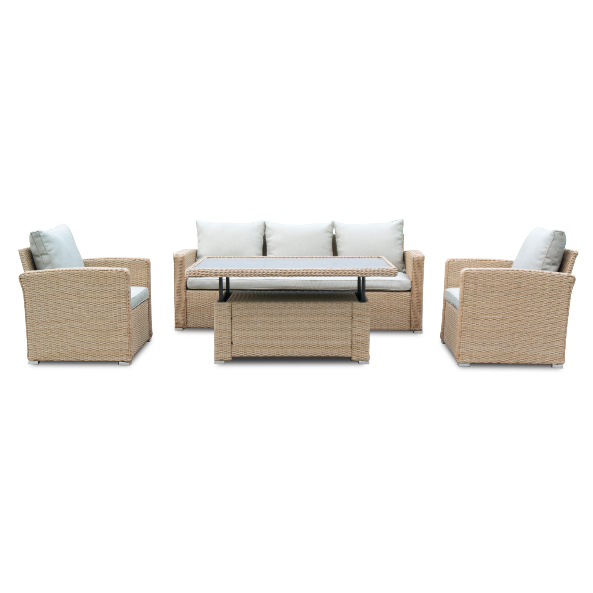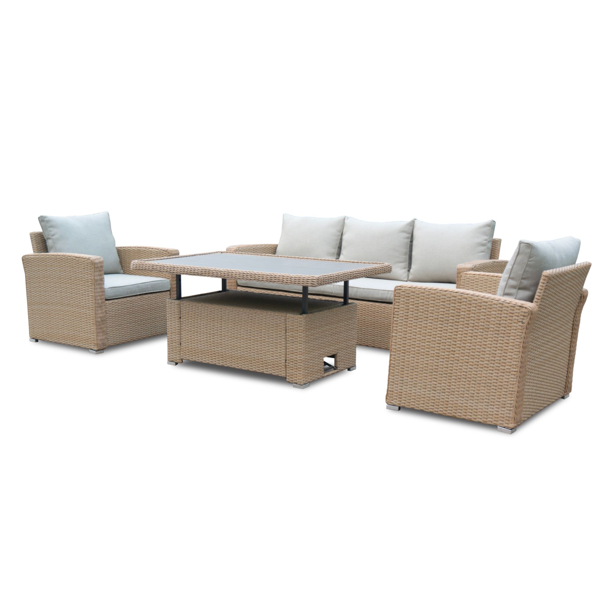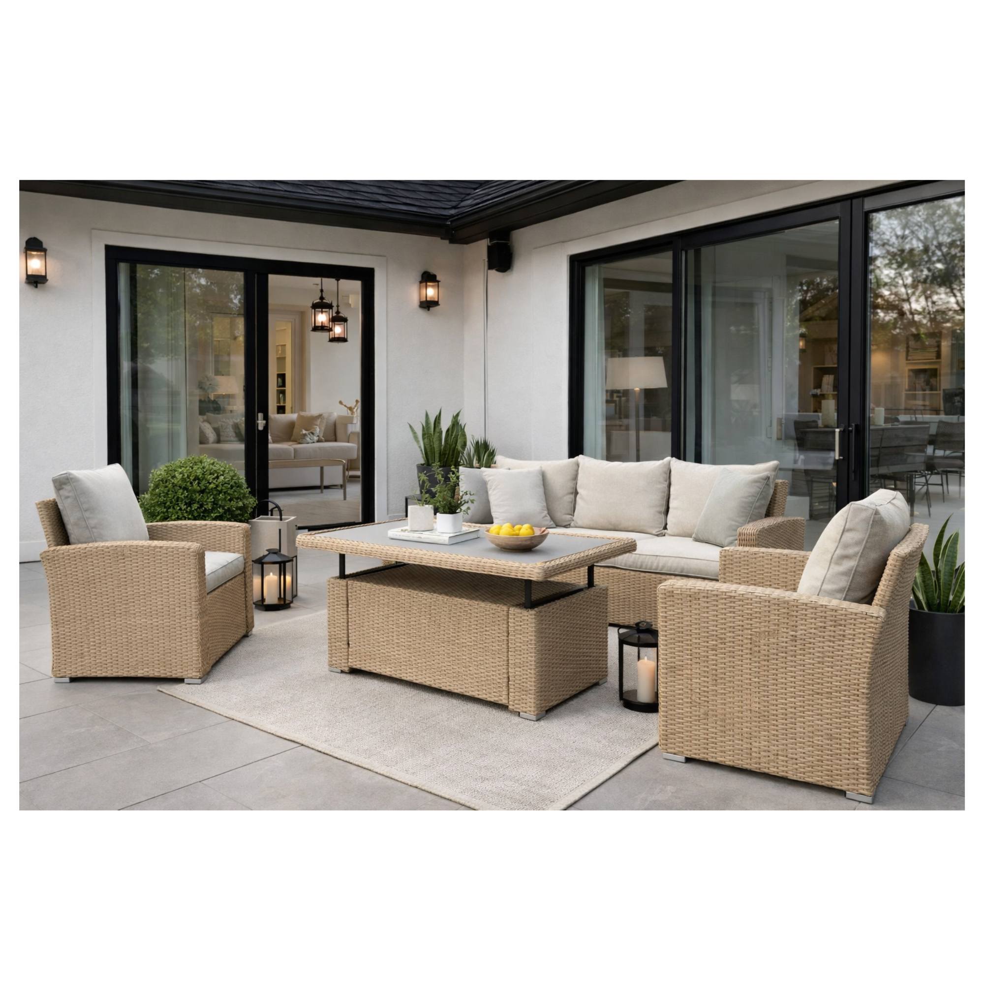 Pevná a stabilní konstrukce tohoto nábytku je vyrobena z ocele a opletena polyratanem. Horní deska stolku je ze skla. Kromě měkkých pěnových sedáků a polštářů s polyesterovým potahem přispívají k pohodlnému sezení na křeslech a pohovce také područky.