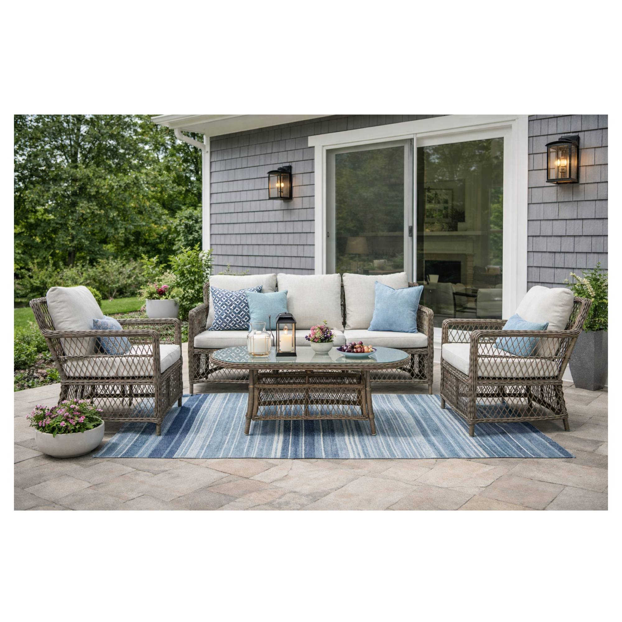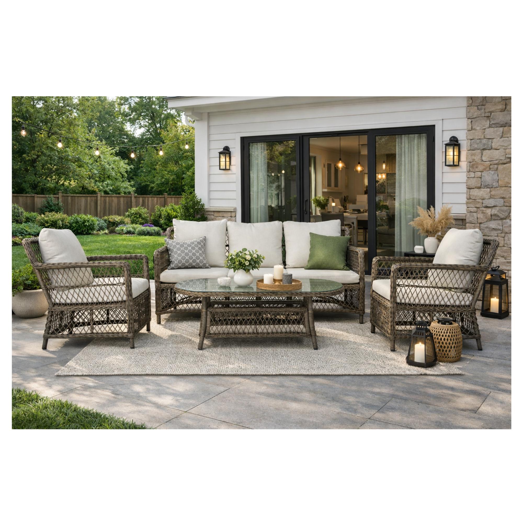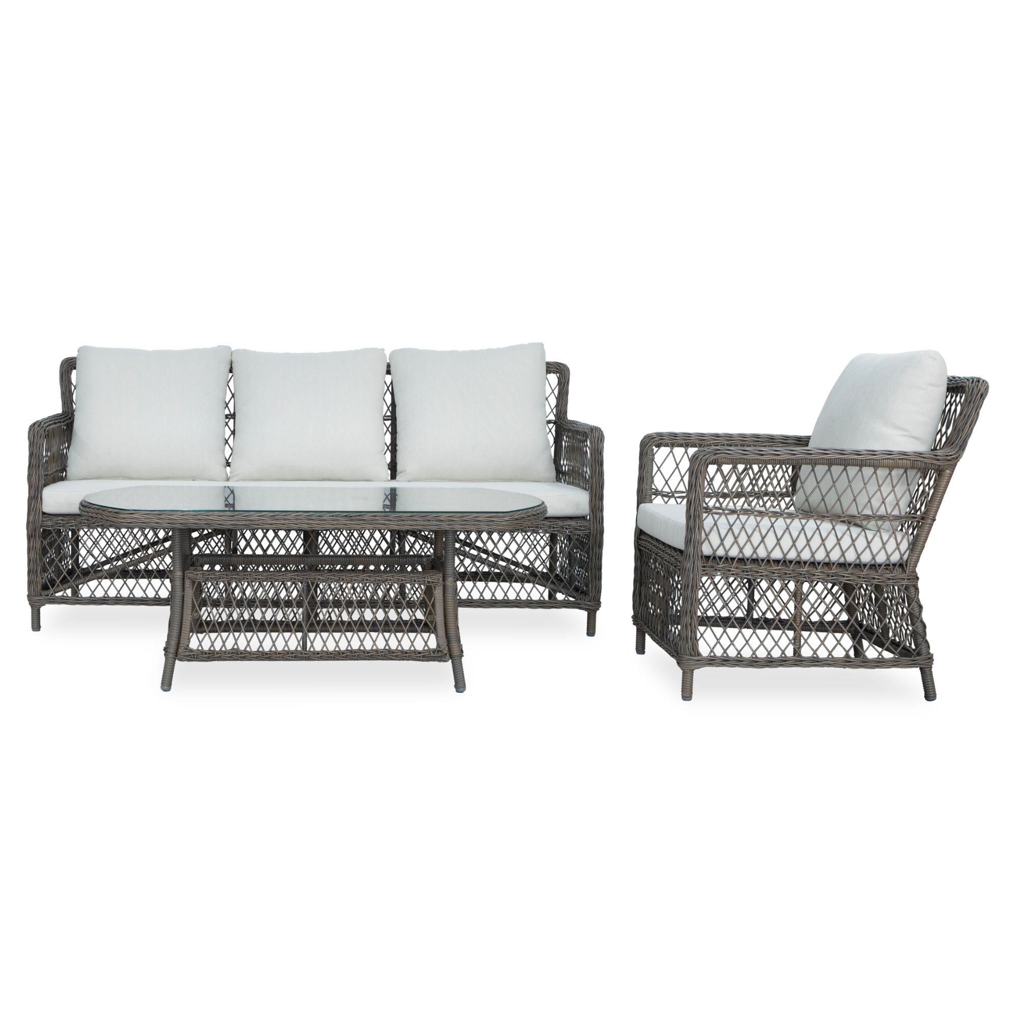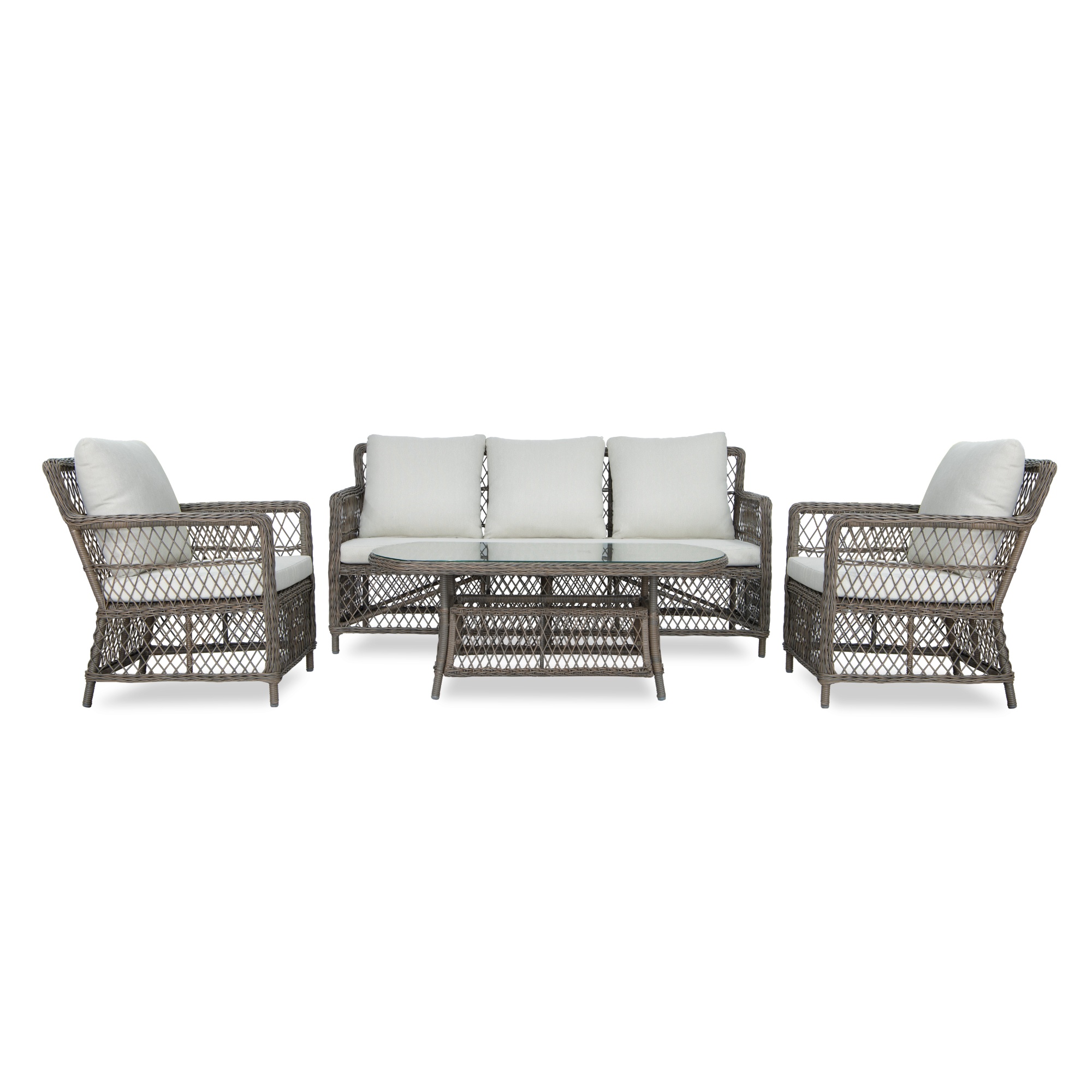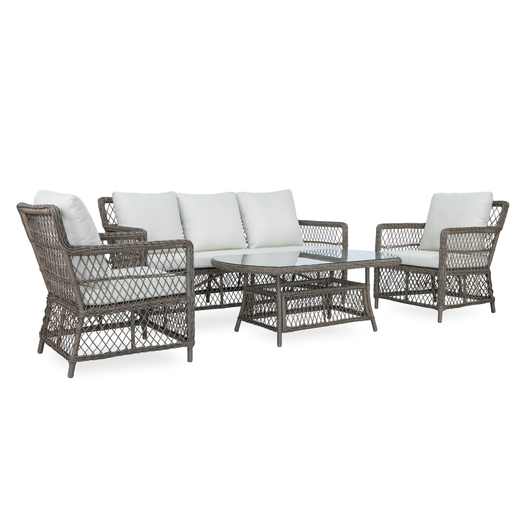 Pevná a stabilní konstrukce tohoto nábytku je vyrobena z ocele a opletena polyratanem. Horní deska stolku je ze skla. Kromě měkkých pěnových sedáků a polštářů s polyesterovým potahem přispívají k pohodlnému sezení na křeslech a pohovce také područky.