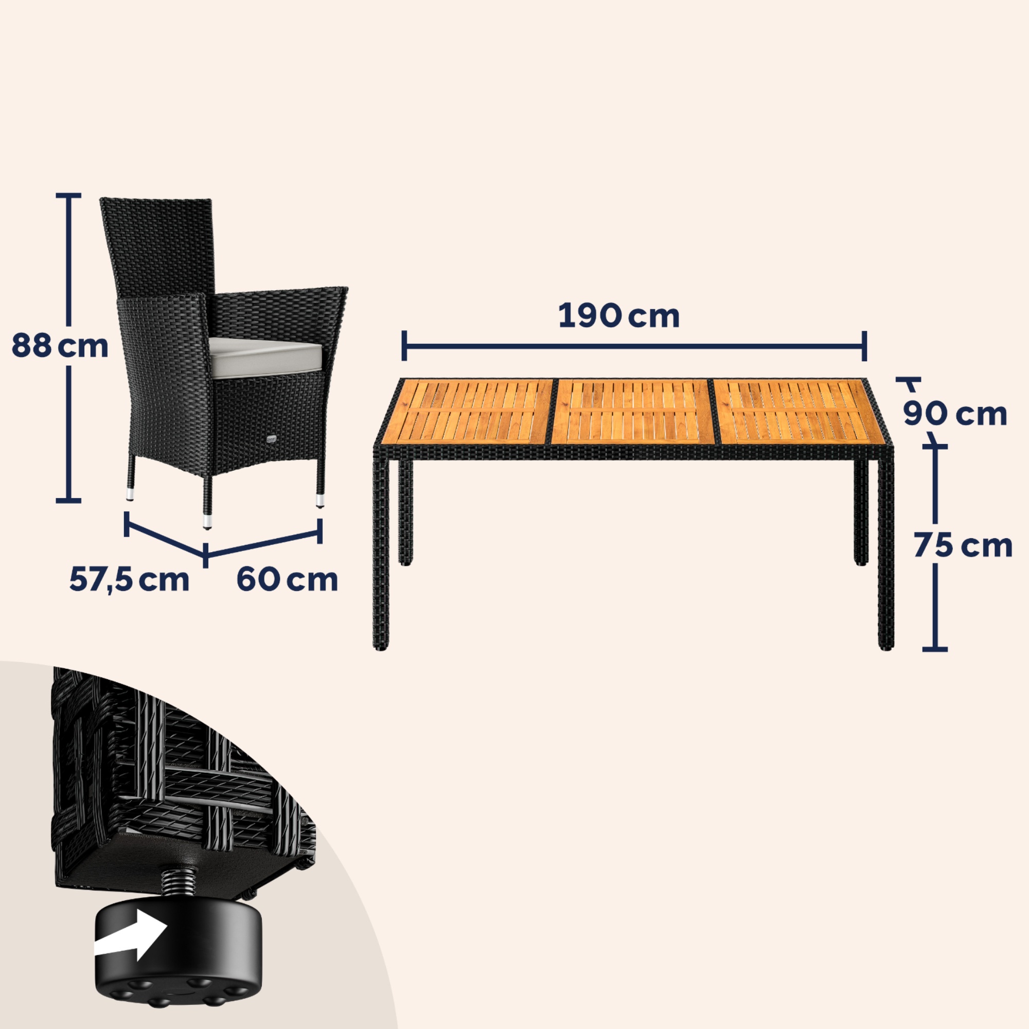 Pevná a stabilní konstrukce tohoto nábytku je vyrobena z pozinkované a práškově lakované ocele a opletena polyratanem. Nohy stolu i křesel jsou zakončeny nastavitelnými šrouby, díky kterým bude set stabilní i na nerovném povrchu. Horní deska stolu je z masivního akáciového dřeva. O pohodlné sezení se starají nejen područky, ale i měkké pěnové sedáky o tloušťce 7 cm. Ty mají voděodolné potahy se zipem, které lze v případě znečištění snadno sundat a vyprat v pračce na 30 °C.