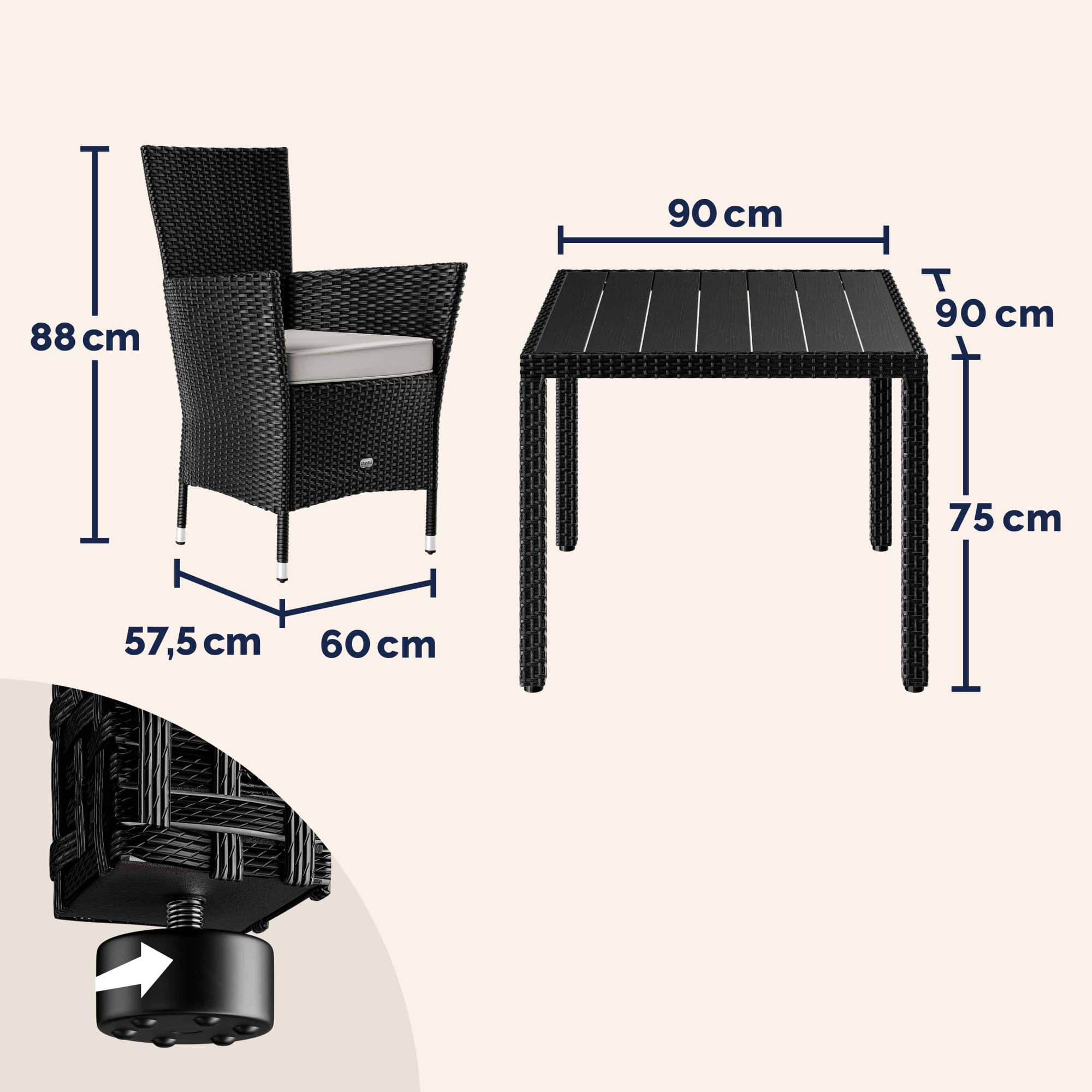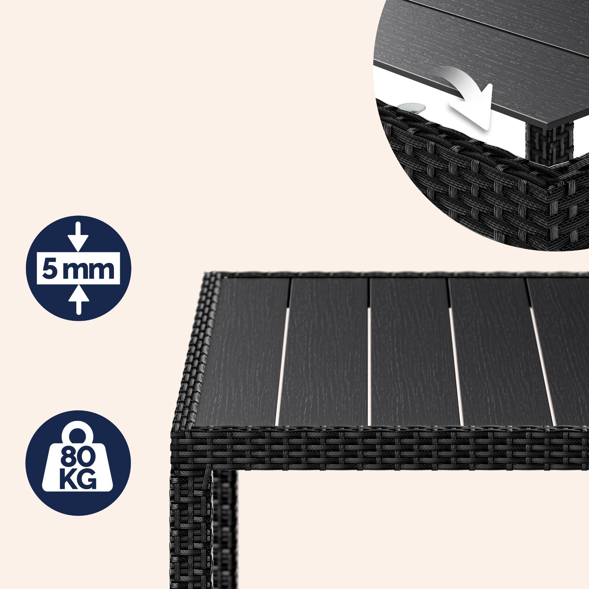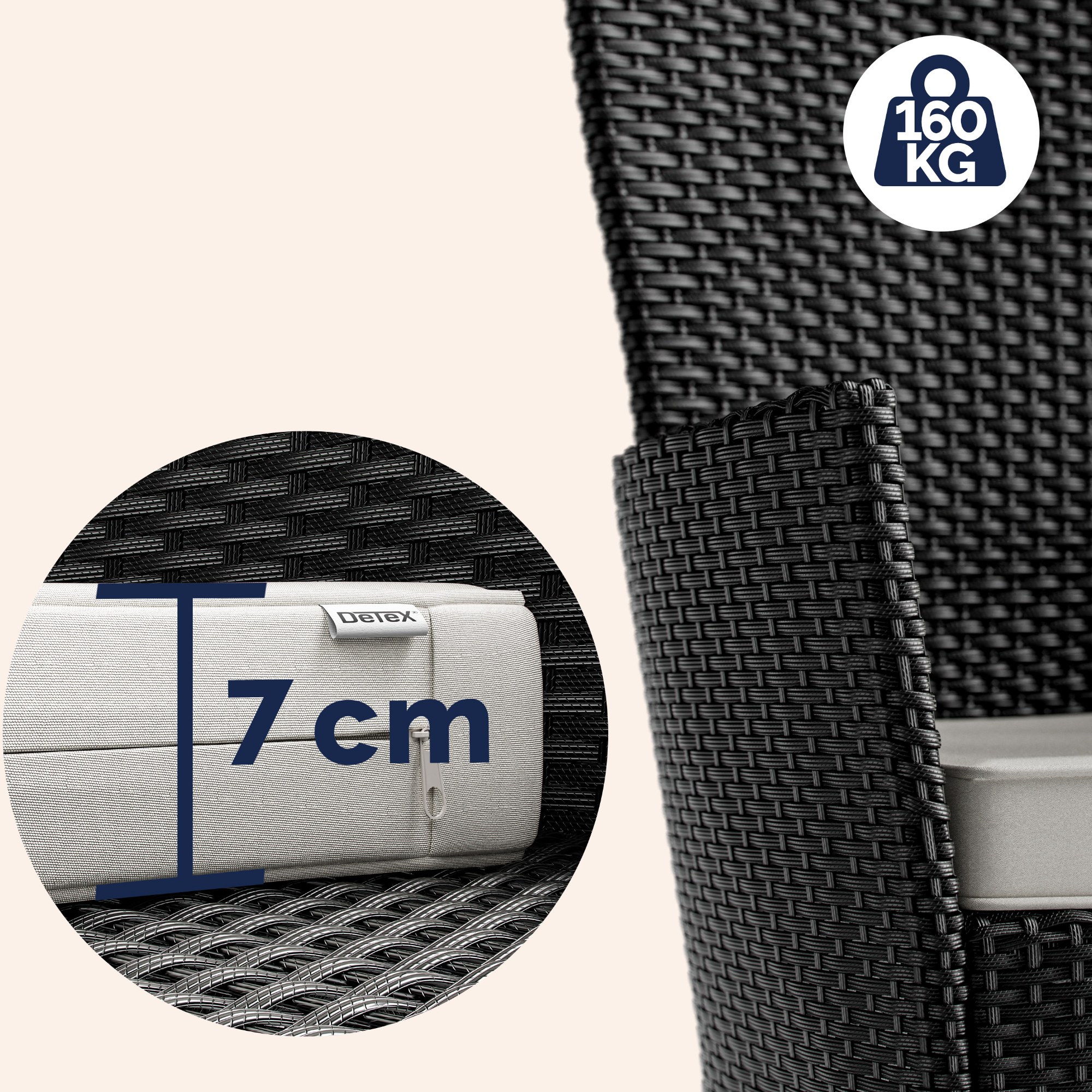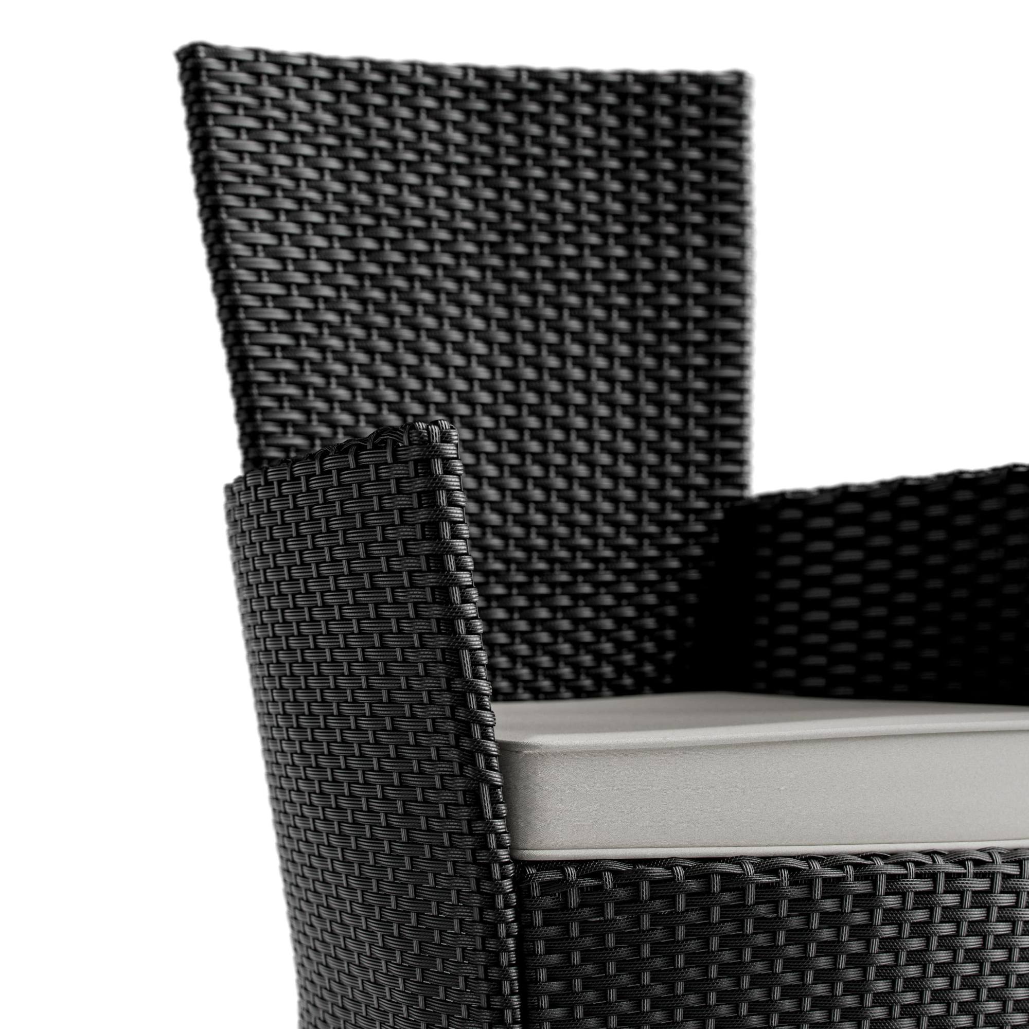 Pevná a stabilní konstrukce tohoto nábytku je vyrobena z ocele a opletena polyratanem. Nohy stolu i křesel jsou zakončeny nastavitelnými šrouby, díky kterým bude set stabilní i na nerovném povrchu. Horní deska stolu je ze snadno udržovatelného materiálu WPC, který je tvořený kombinací dřevité hmoty a plastu. O pohodlné sezení se starají nejen područky, ale i měkké pěnové sedáky o tloušťce 7 cm. Ty mají vodoodpudivé potahy se zipem, které lze v případě znečištění snadno sundat a vyprat v pračce na 30 °C.