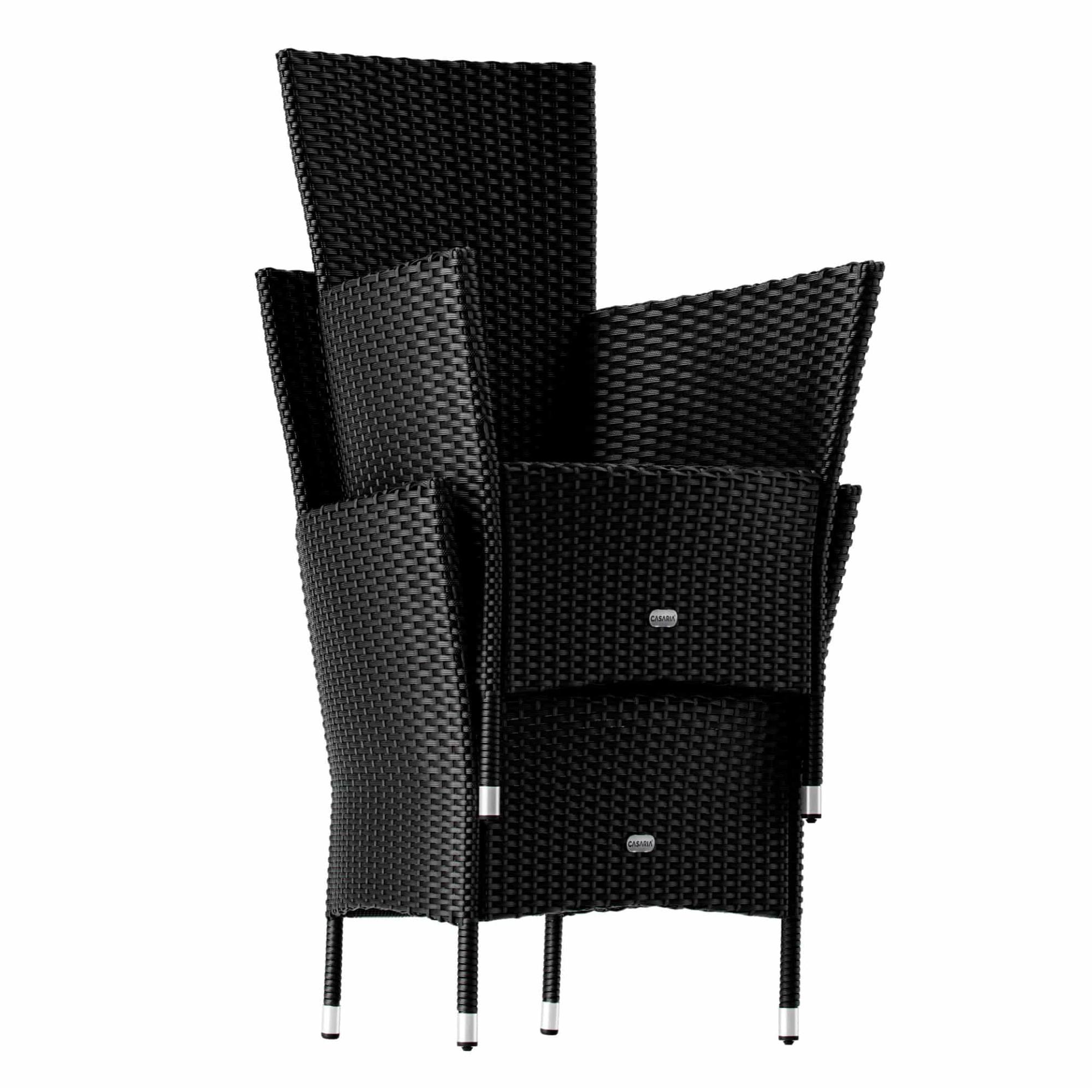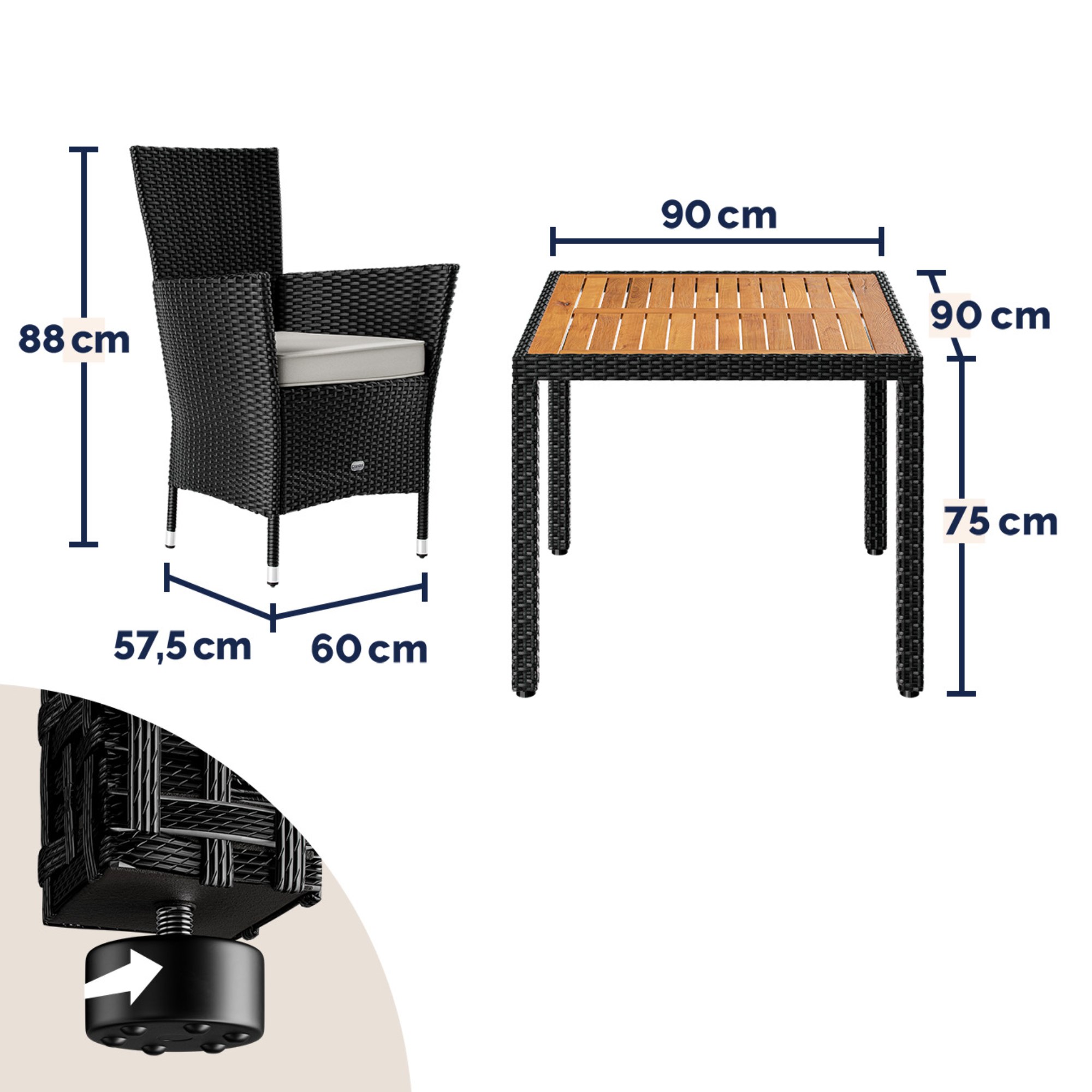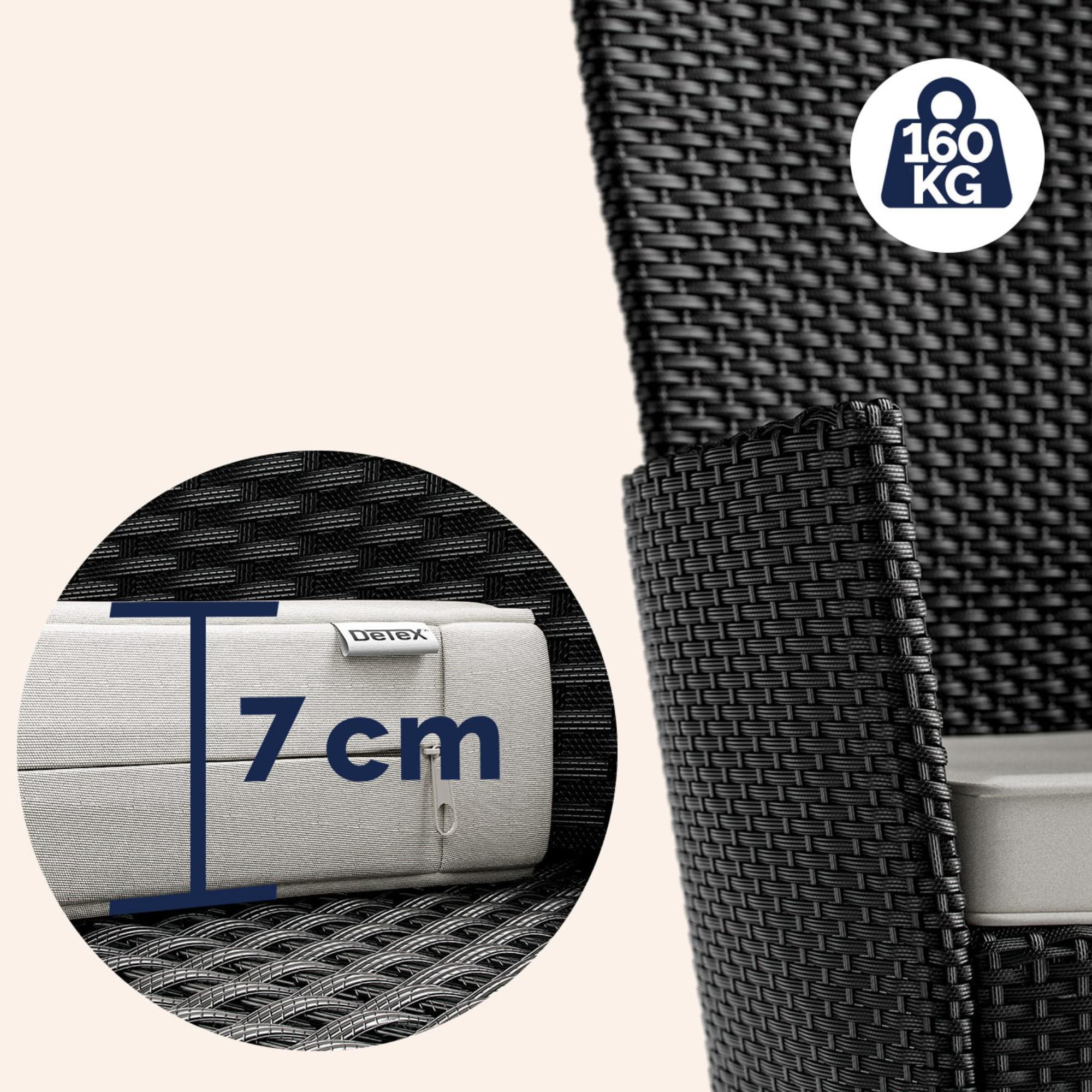 Pevná a stabilní konstrukce tohoto nábytku je vyrobena z práškově lakované ocele a opletena polyratanem. Nohy stolu i křesel jsou zakončeny nastavitelnými šrouby, díky kterým bude set stabilní i na nerovném povrchu. Horní deska stolu je z masivního akáciového dřeva. O pohodlné sezení se starají nejen područky, ale i měkké pěnové sedáky o tloušťce 7 cm. Ty mají potahy se zipem, které lze v případě znečištění snadno sundat a vyprat v pračce na 30 °C.