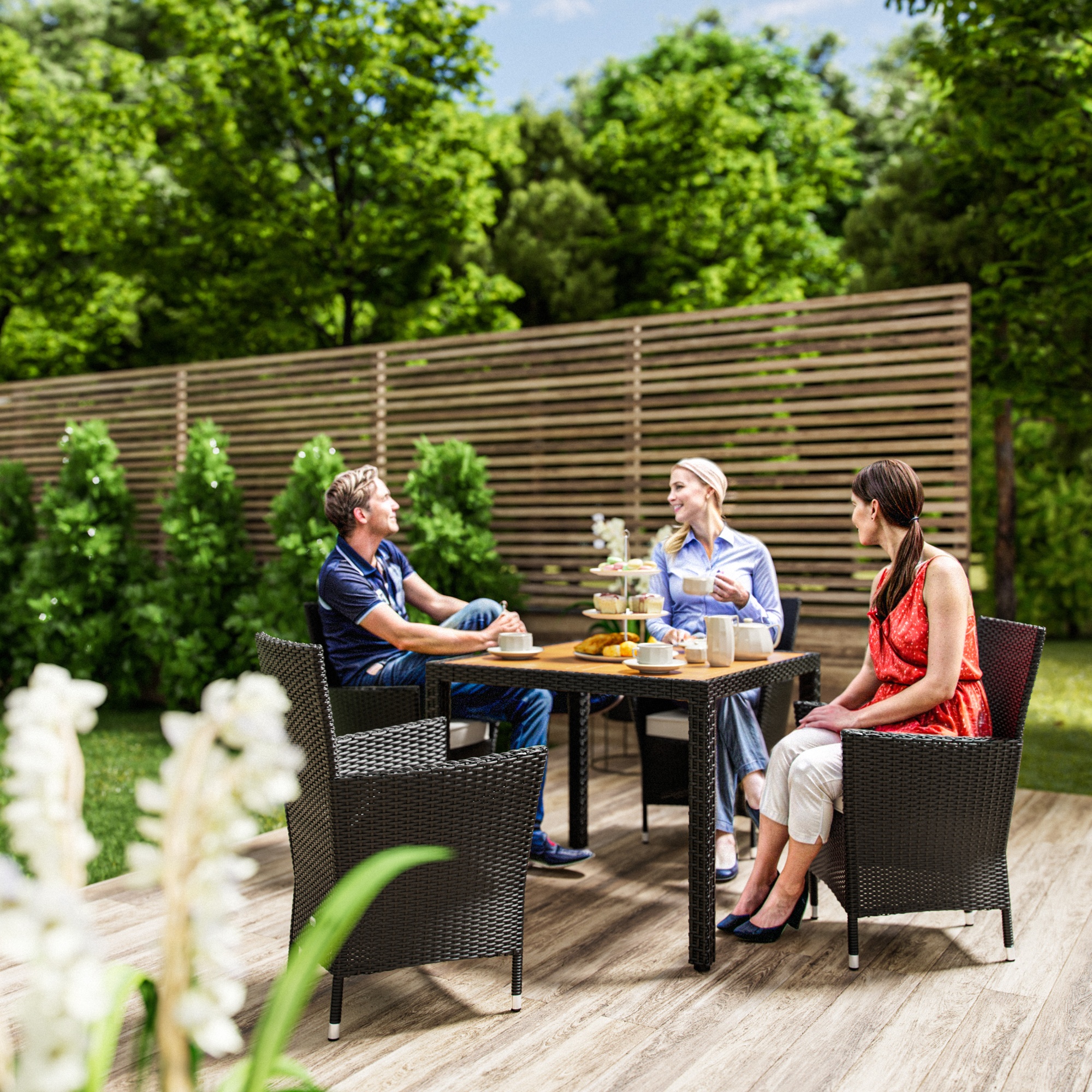 Zahradní set VERONA 3, který díky svému modernímu vzhledu zazáří v každé zahradě, se skládá ze stolu a 4 stohovatelných křesel.