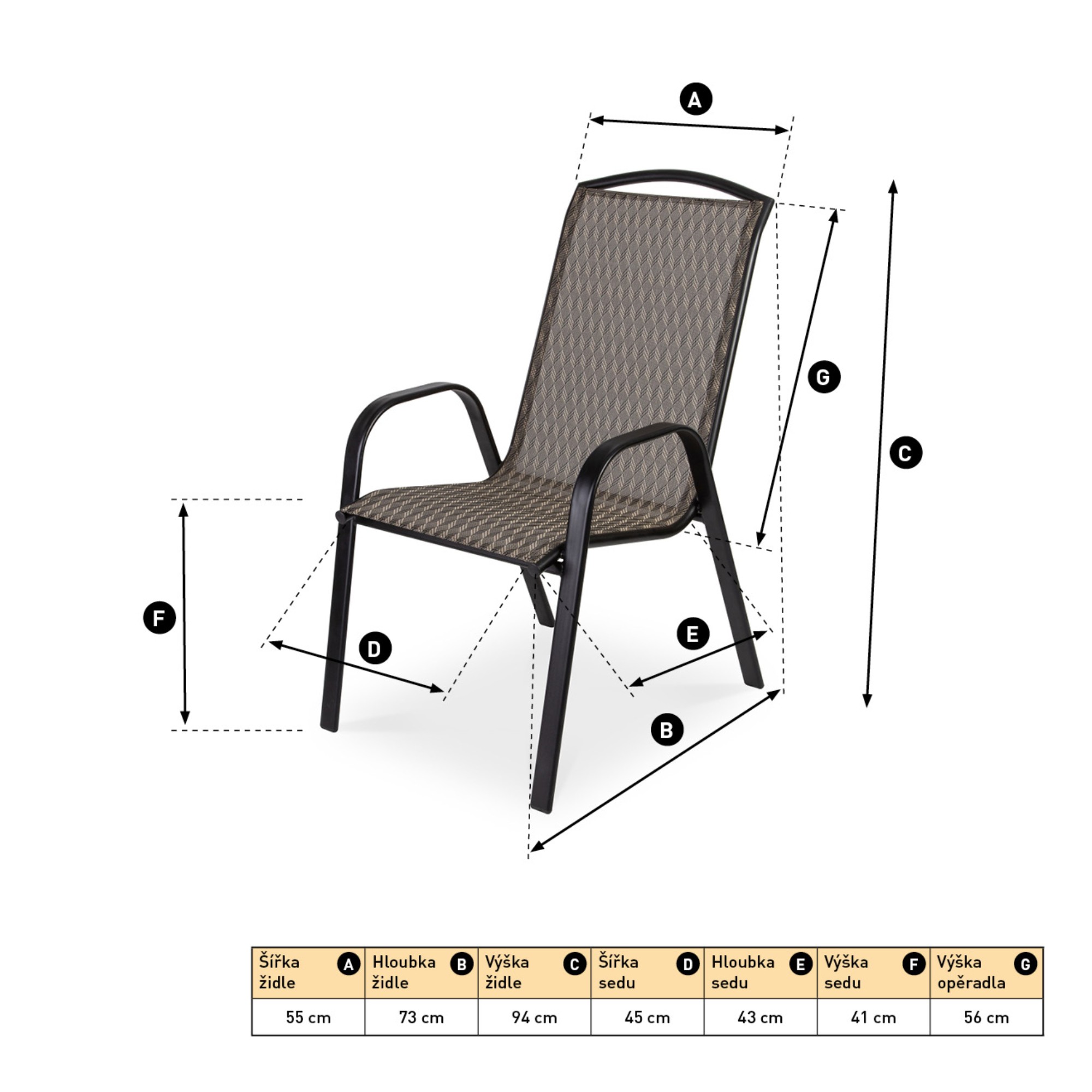 Pevná a stabilní konstrukce této židle je vyrobena z kovu. Konstrukce je vyplněna odolnou umělou textilií, která je nenáročná na údržbu.