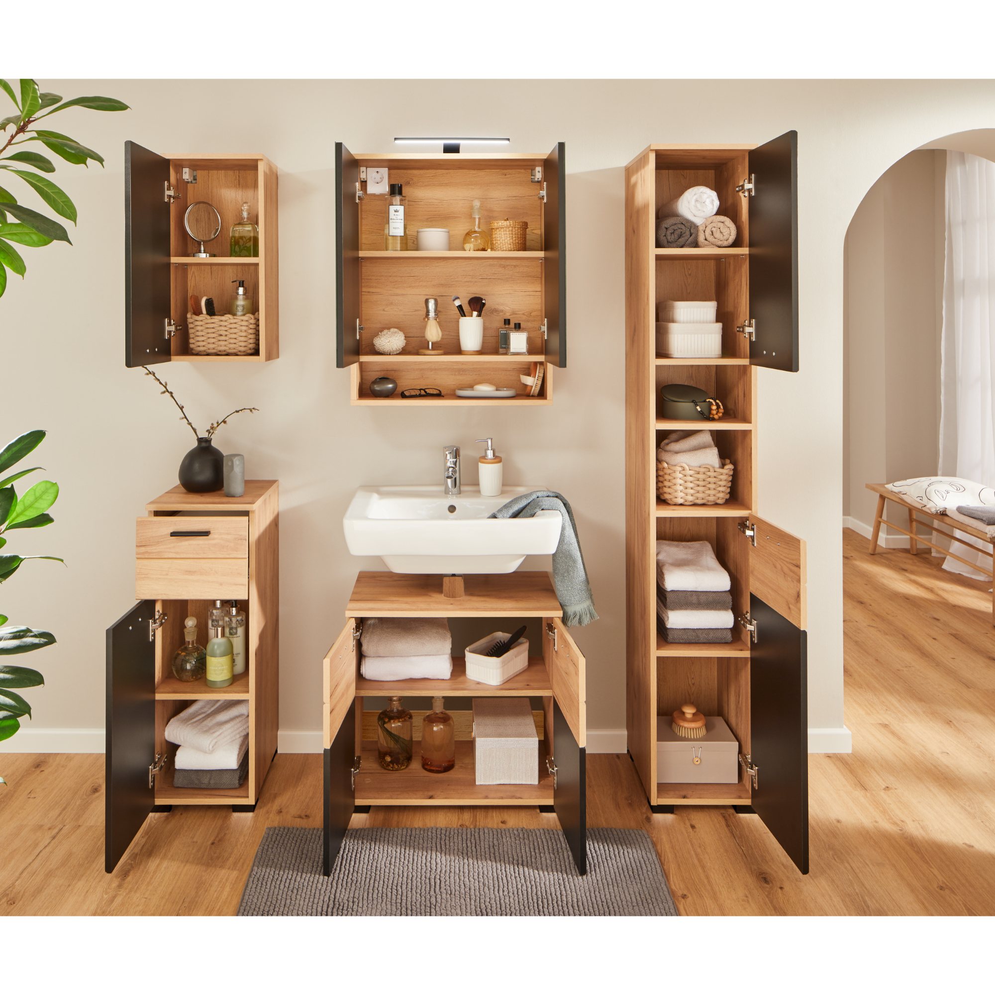 Za otočnými dvířky v matném provedení najdete jednu polici, která poskytne zázemí pro kosmetiku a doplňky do koupelny.