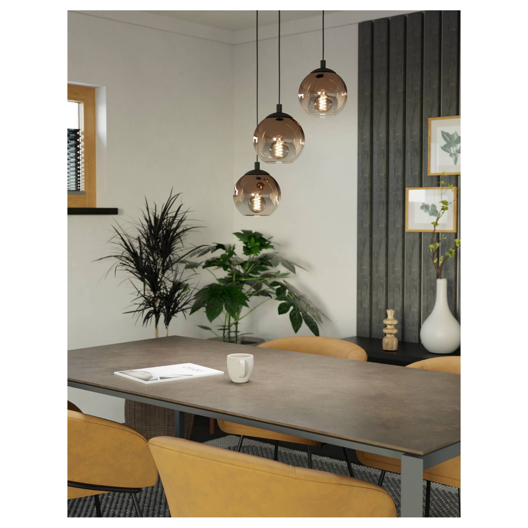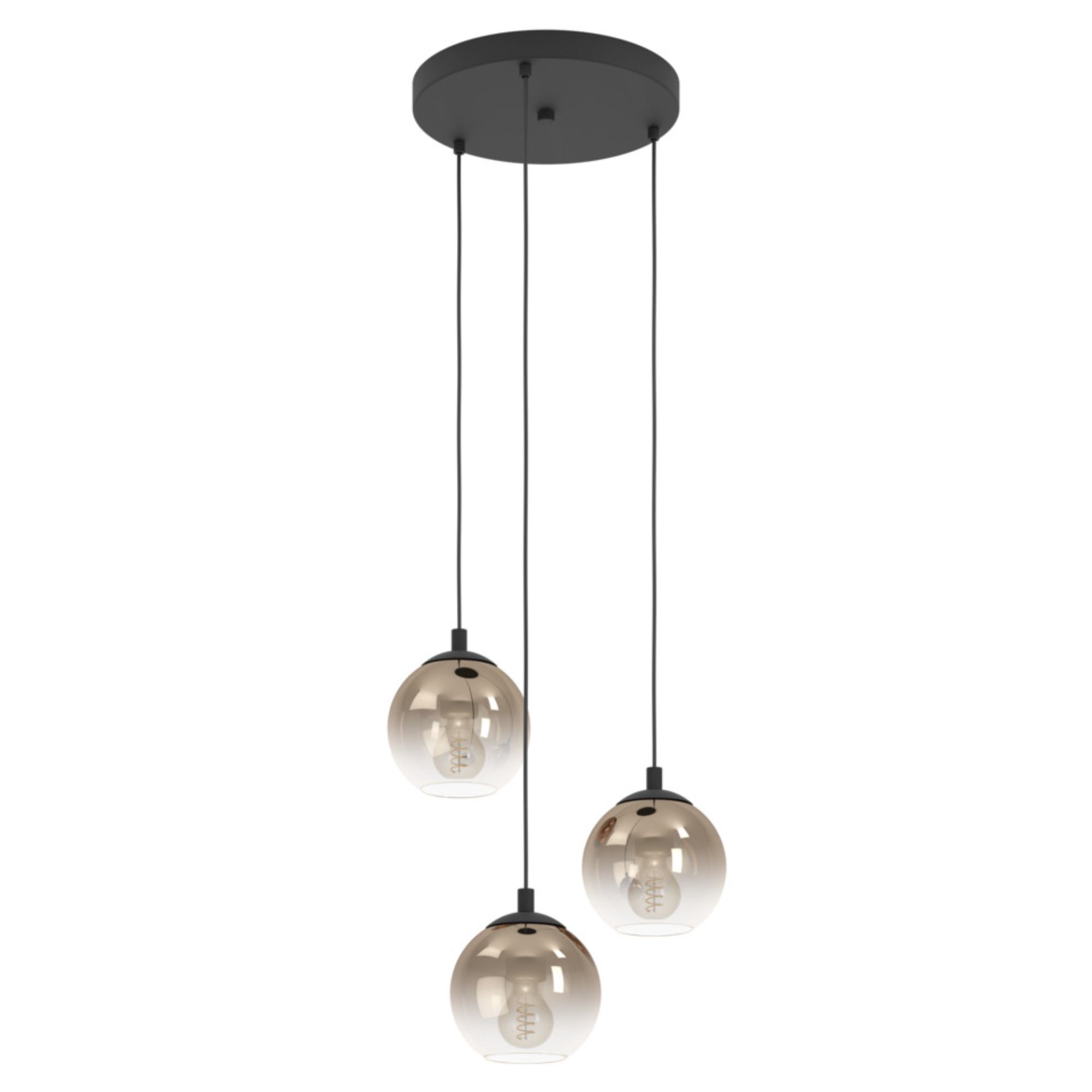Má kovovou konstrukci s průměrem 43 cm v matném černém provedení, na které jsou zavěšeny 3 stínidla. Ta jsou vyrobena ze skla s použitím kouřového efektu, který jim dodává neobyčejný retro nádech. Doporučujeme použít žárovky v retro designu například se spirálovou diodou, čímž posunete svítidlo na další úroveň. Je ideálním osvětlením nad jídelní či konferenční stůl.