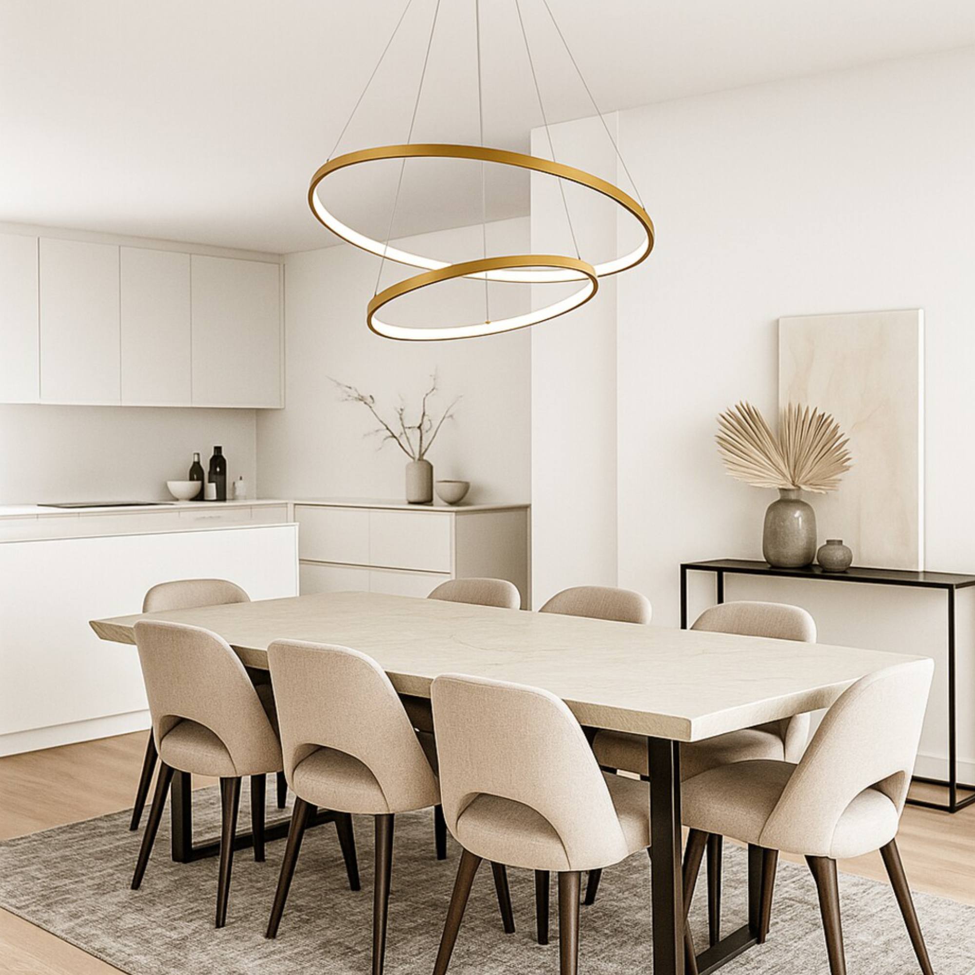Zaujme svou konstrukcí, složenou ze 2 různě velkých kruhů, které ze svítidla vytvářejí jedinečný designový prvek každé místnosti. Kruhy lze navíc nastavit podle potřeby pomocí kovových lanek. Je vyrobeno z kovu a zavěšeno na kulaté základně. Bude ideálním osvětlením nad konferenční či jídelní stůl.
