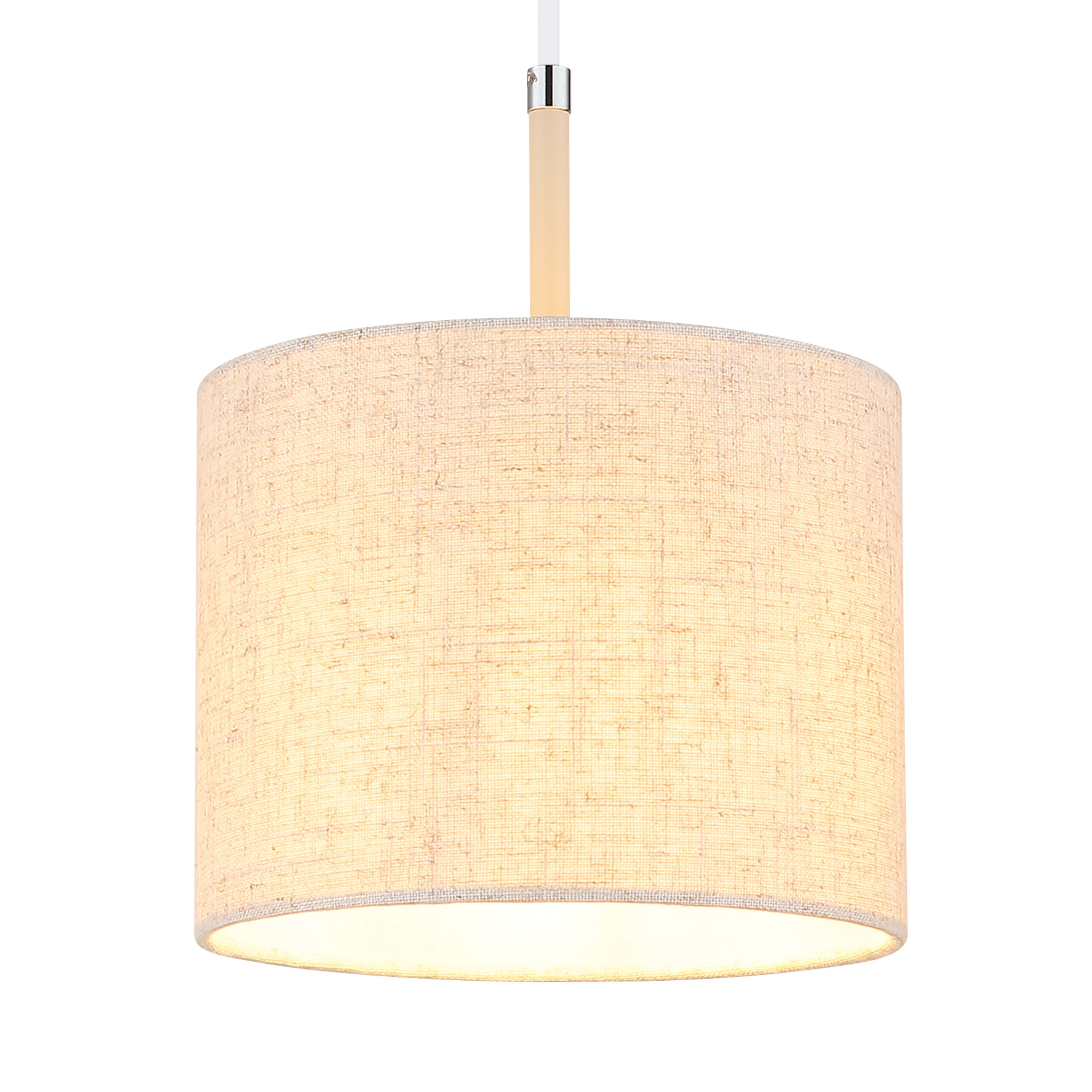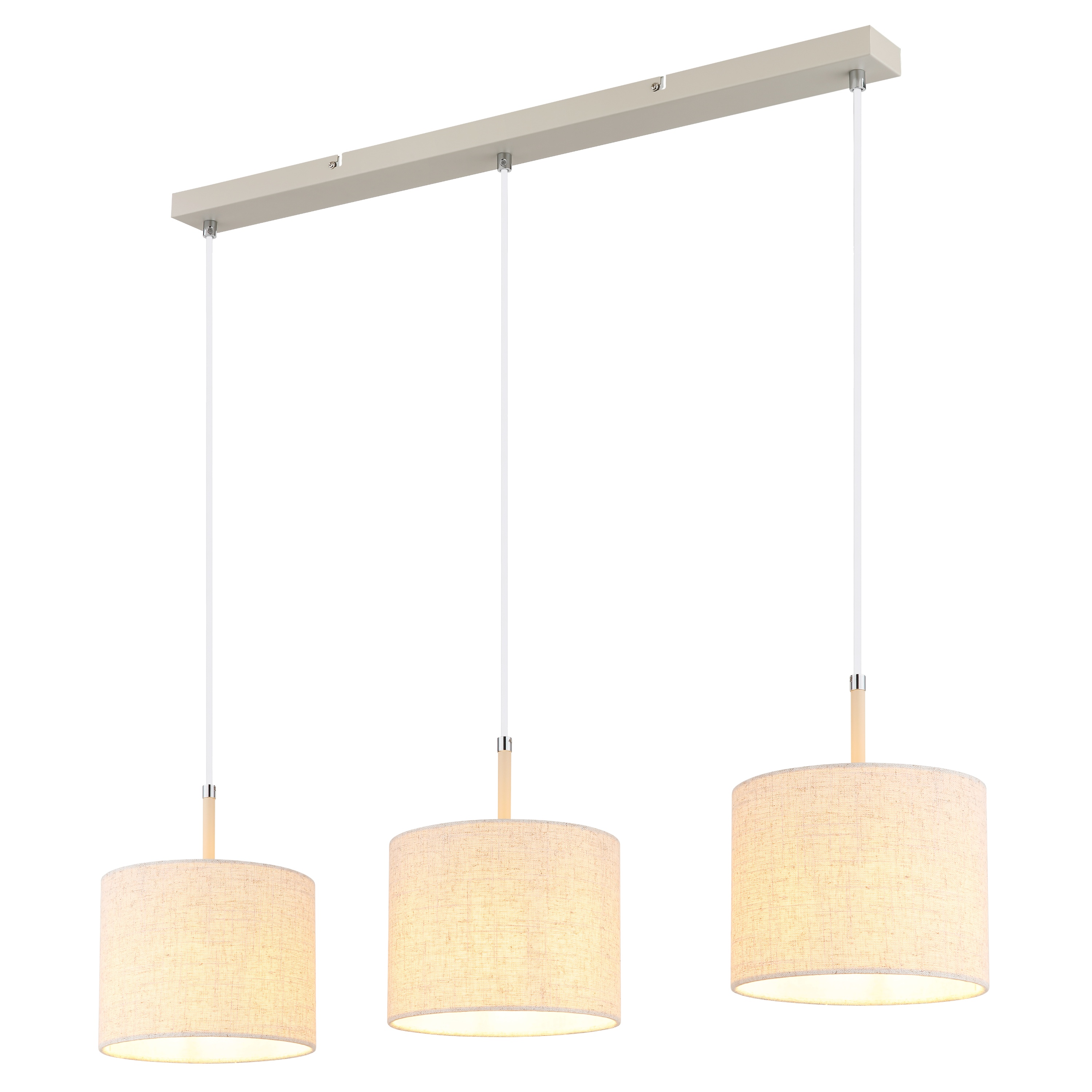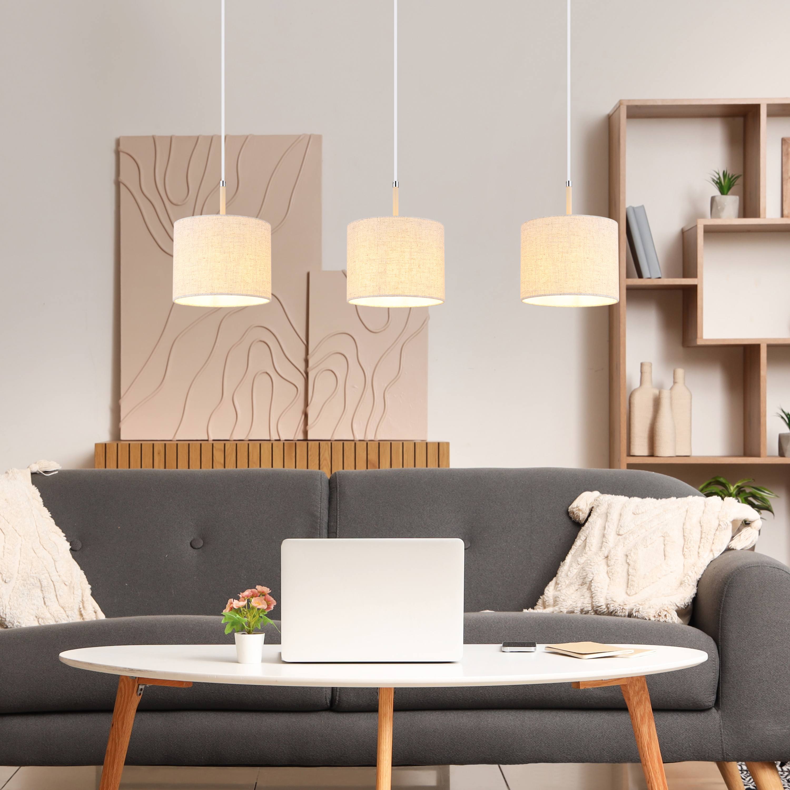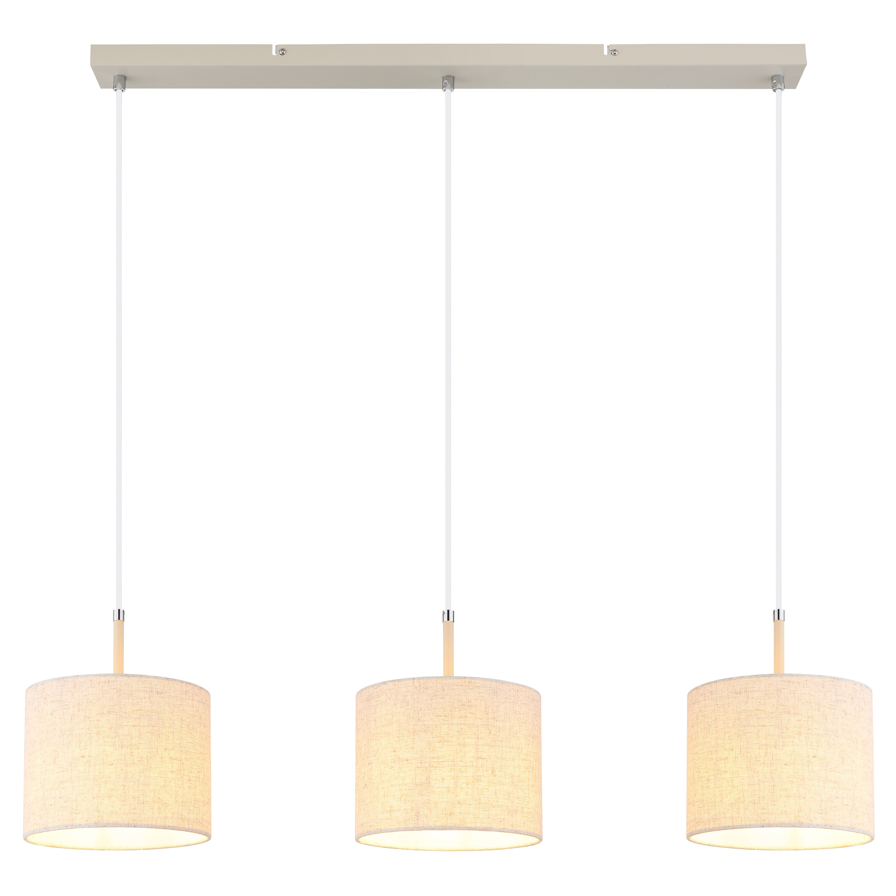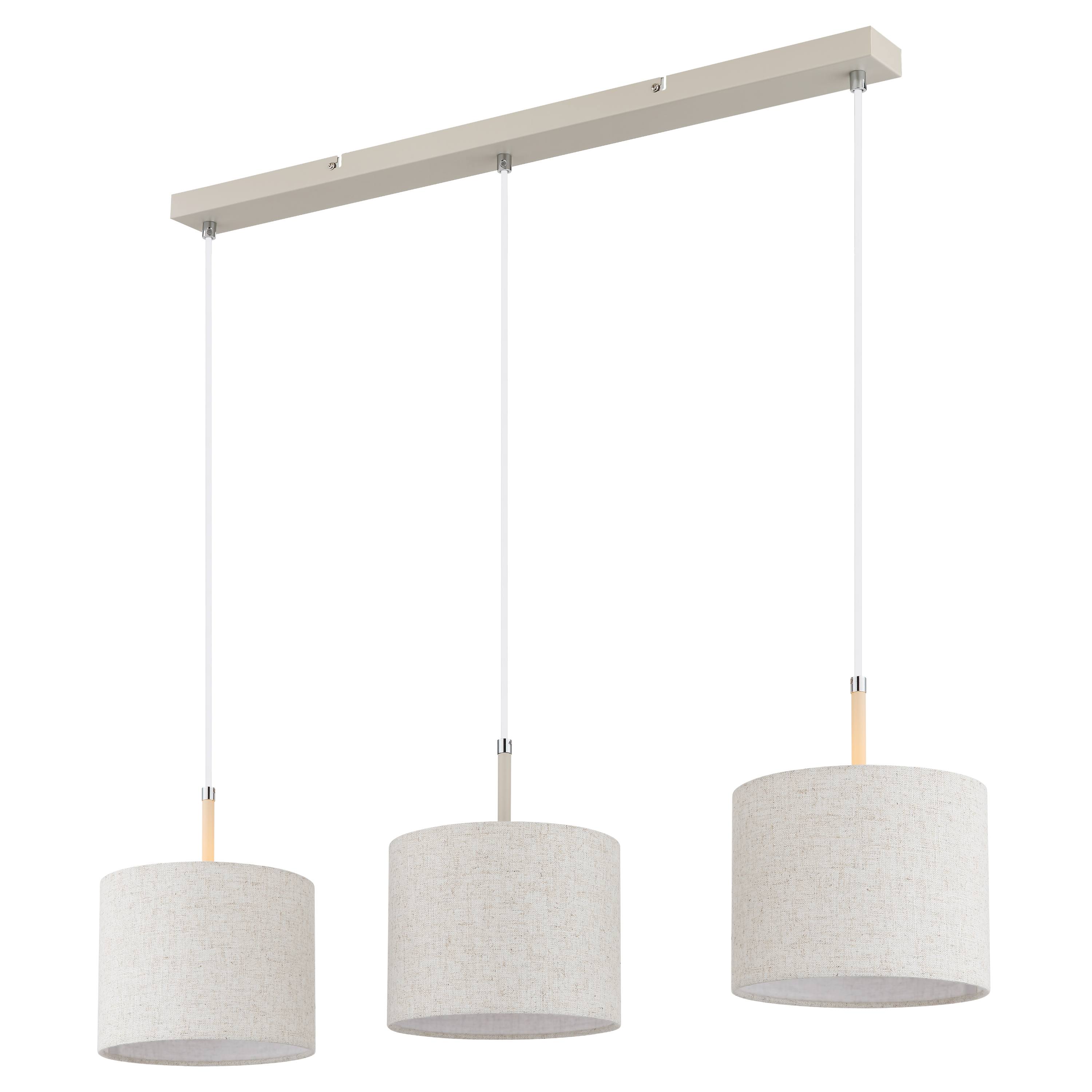 Svítidlo je vybaveno ** 3 klasickými textilními stínidly**, která poskytují jemné, rozptýlené světlo, čímž vytváří příjemnou atmosféru v místnosti. Stínidla jsou zavěšena na jednoduché kovové konstrukci v pískové barvě, která se stínidly skvěle ladí. Praktickým prvkem je nastavitelná výška, kterou snadno přizpůsobíte dle potřeby při montáži. Je ideální volbou nad konferenční stolek, jídelní stůl nebo barový pult.