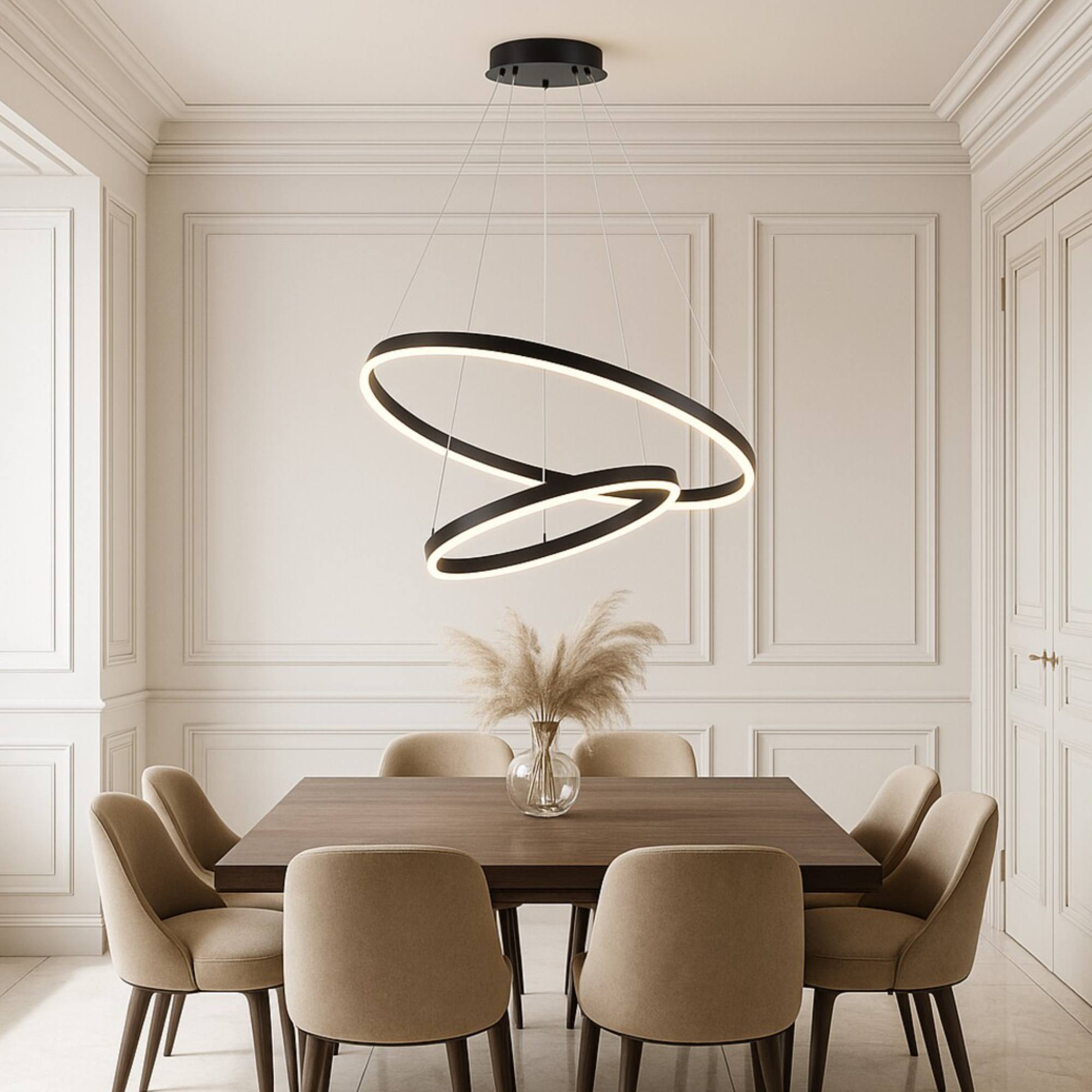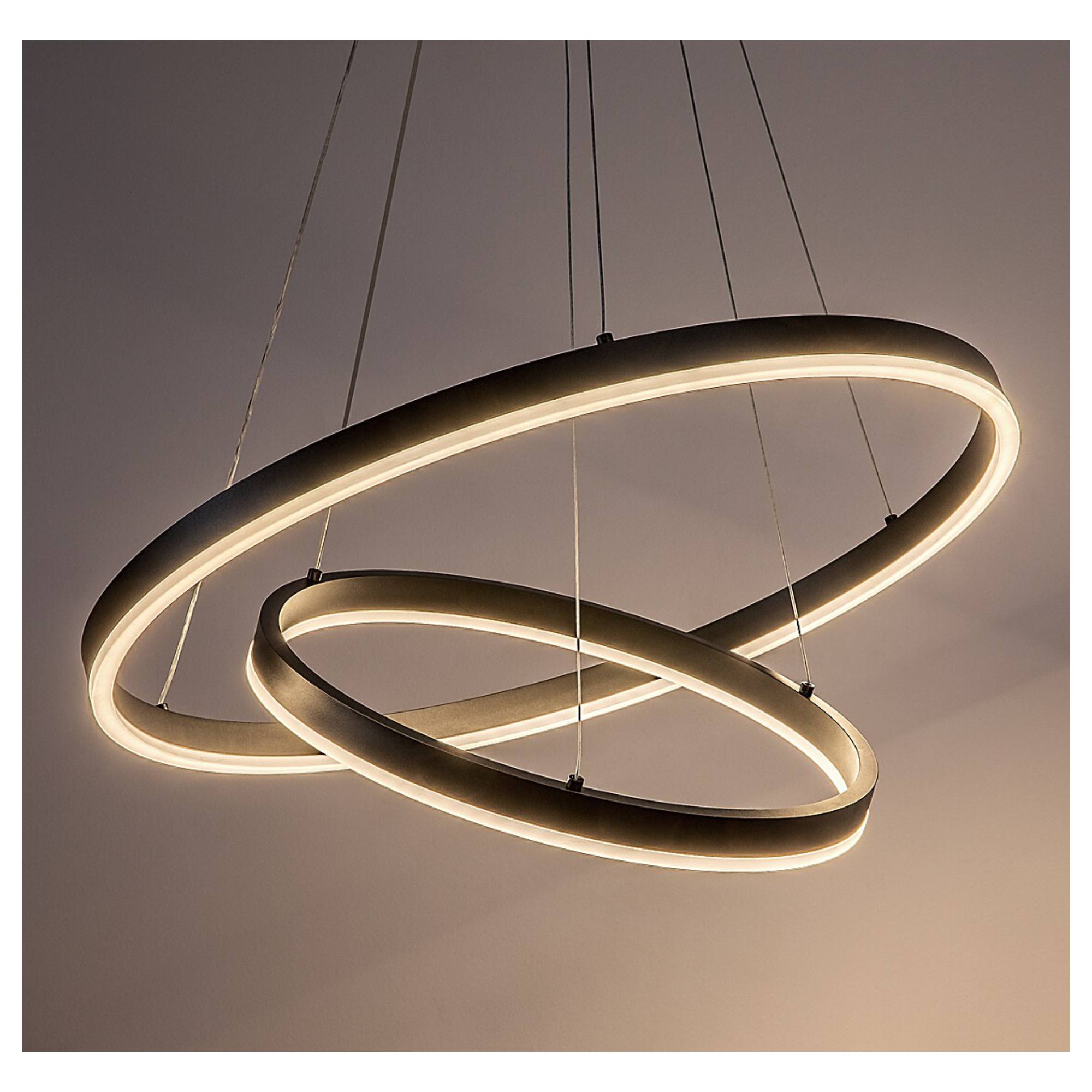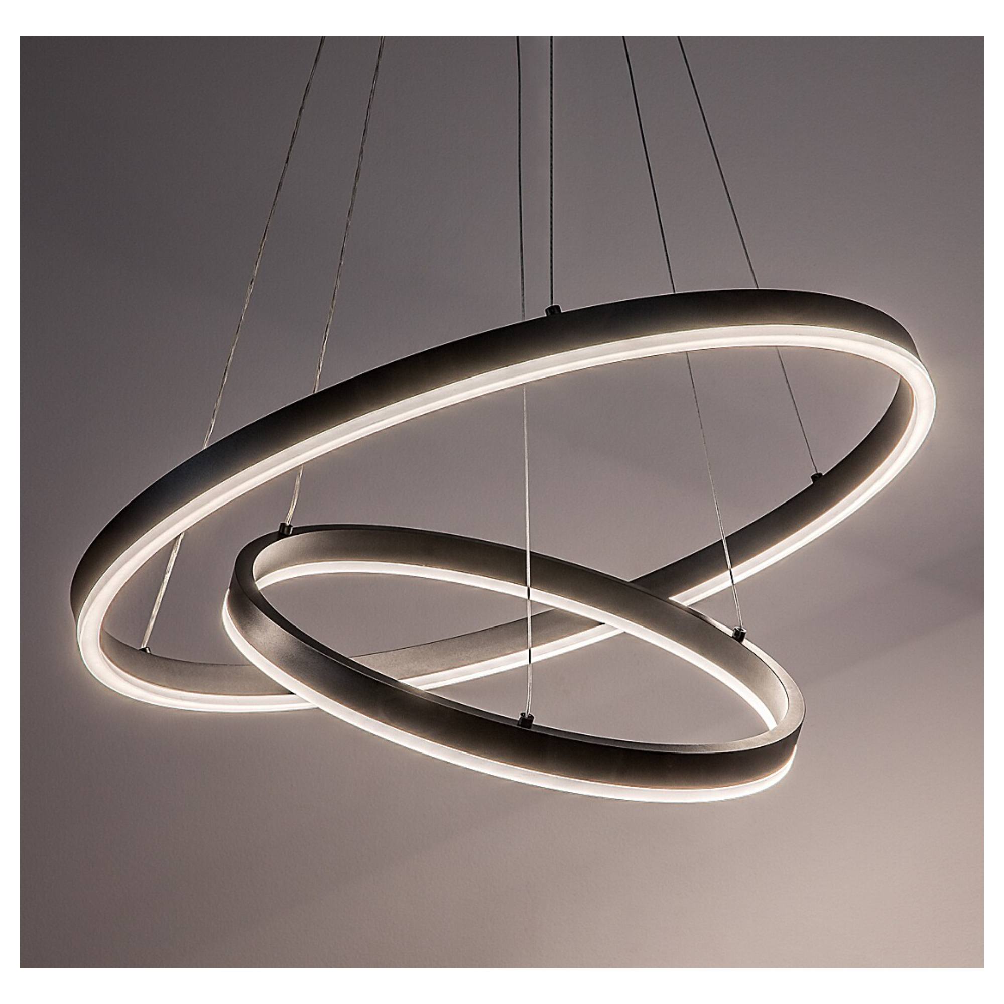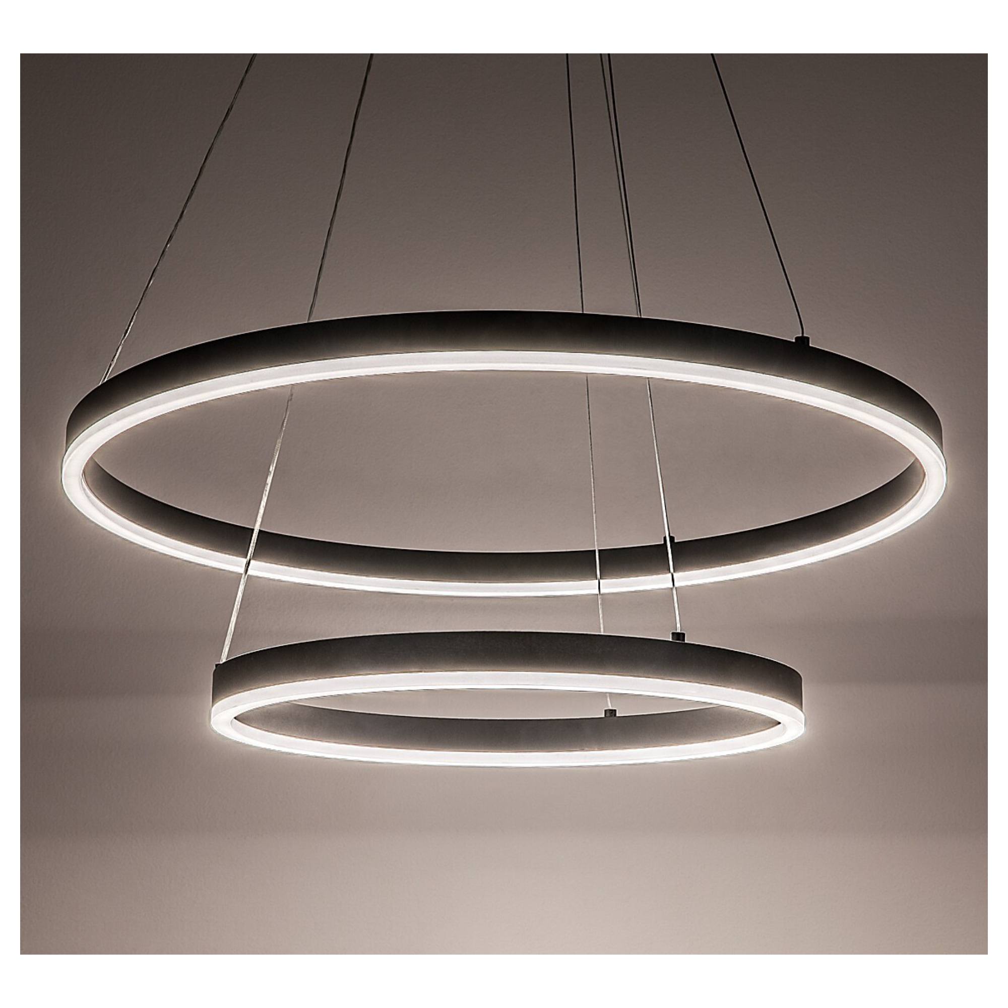 Zaujme svou konstrukcí, složenou ze 2 různě velkých kruhů, které ze svítidla vytvářejí jedinečný designový prvek každé místnosti. Kruhy lze navíc nastavit podle potřeby pomocí kovových lanek. Je vyrobeno z kovu a zavěšeno na kulaté základně. Bude ideálním osvětlením nad konferenční či jídelní stůl.
