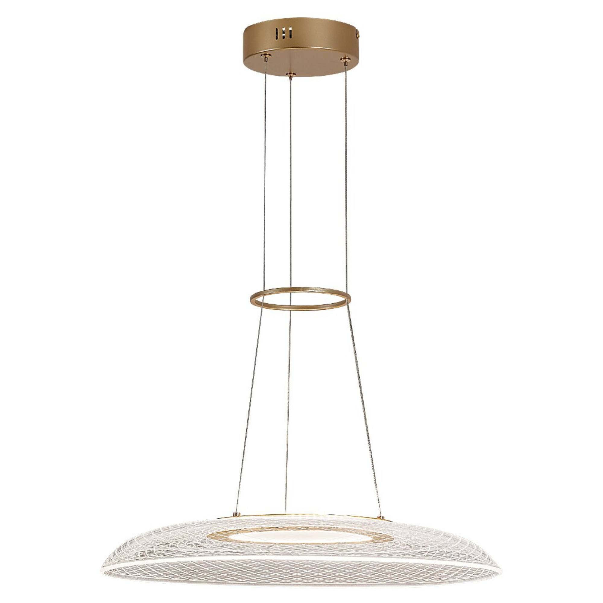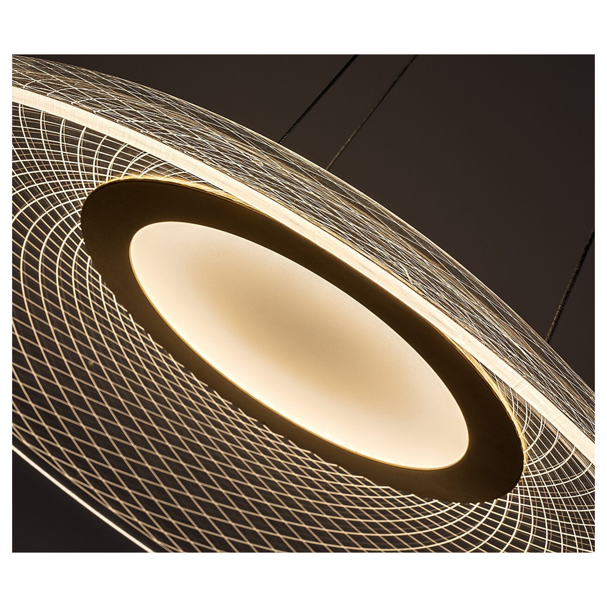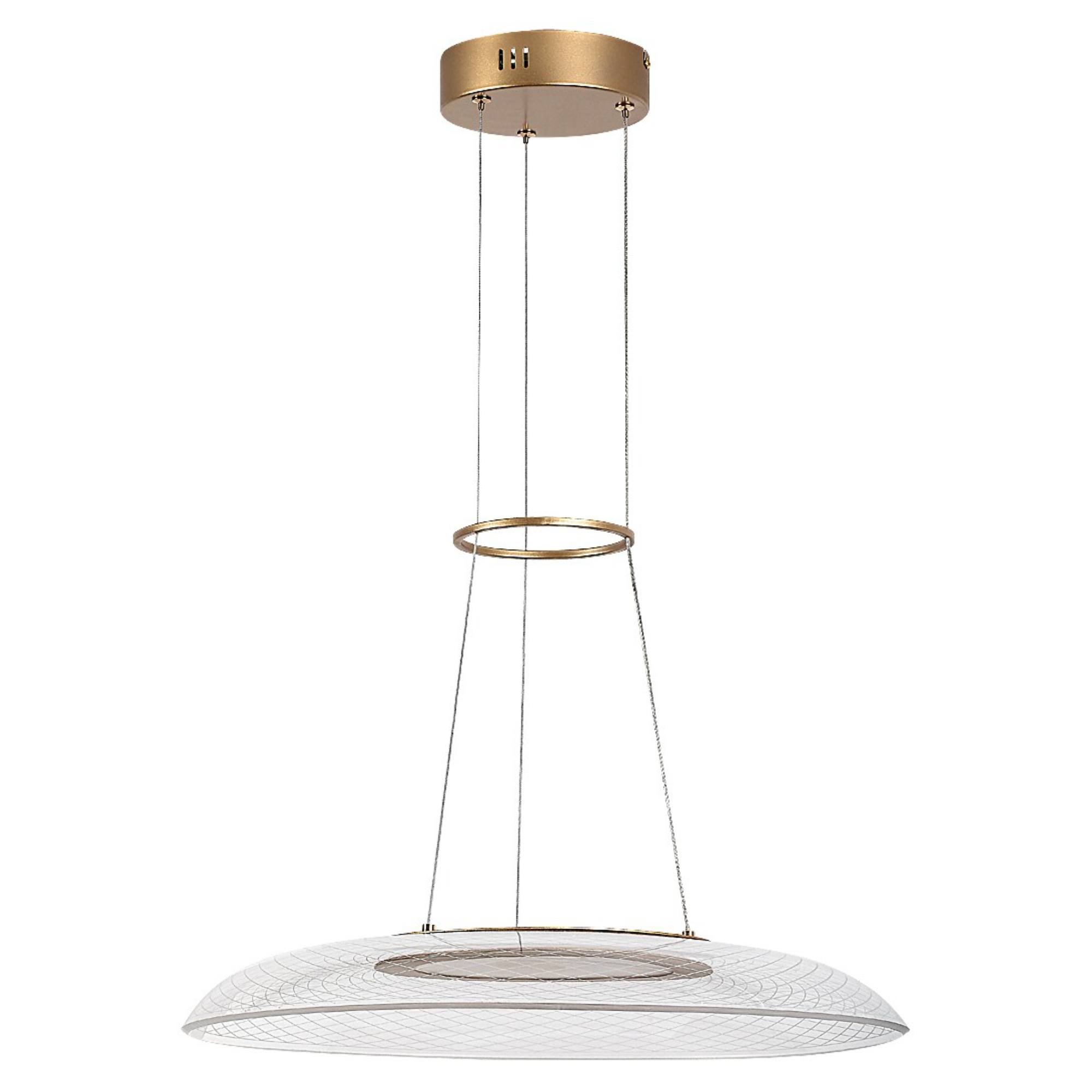 Zaujme na první pohled svým designovým stínidlem, které tvoří dominantní prvek svítidla. Stínidlo je vyrobeno z průhledného akrylu v kruhovém tvaru o průměru 50 cm. Akryl je navíc doplněn jemným vzorem, jež vytváří příjemné atmosférické osvětlení. Elegantním doplňkem je zlatý kovový kruh ve středu svítidla. Stínidlo je k jednoduché konstrukci upevněno pomocí kovových lanek. Bude ideálním osvětlením nad konferenční či jídelní stůl.
