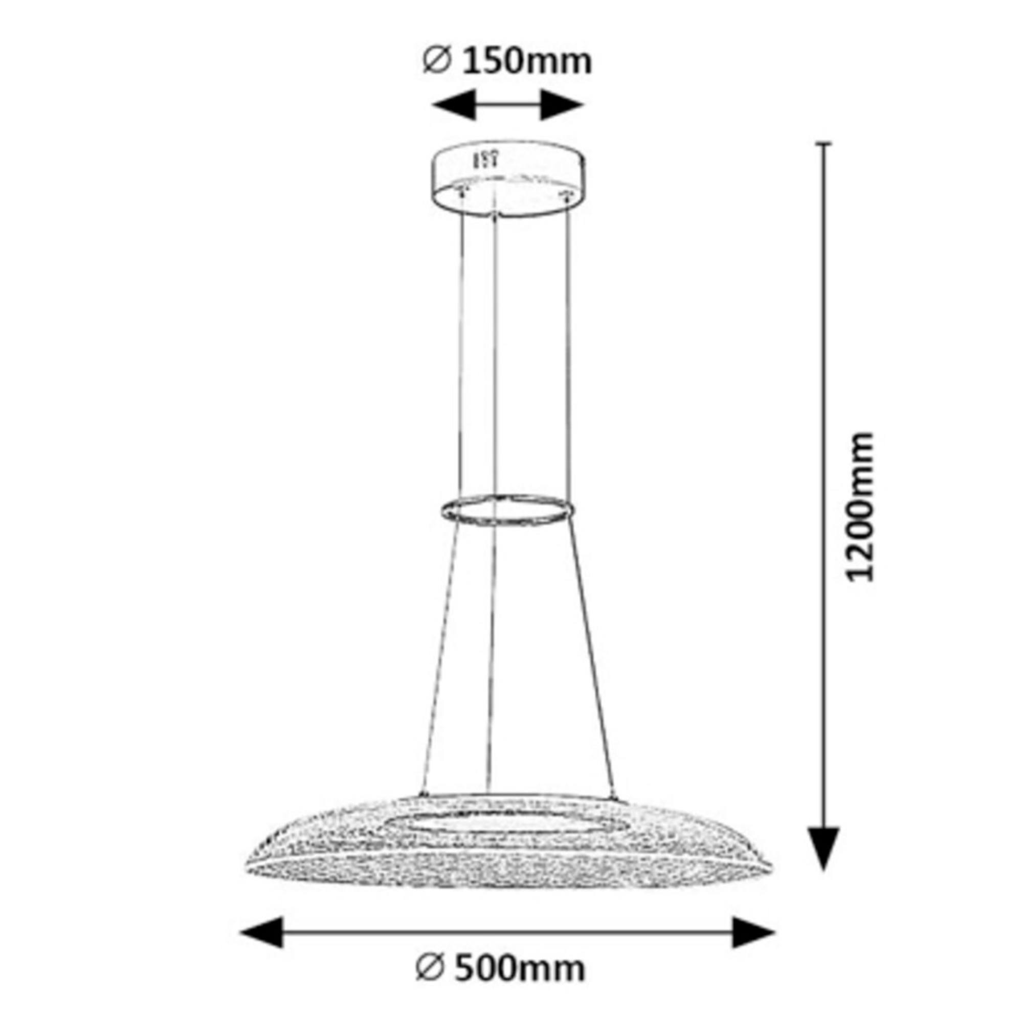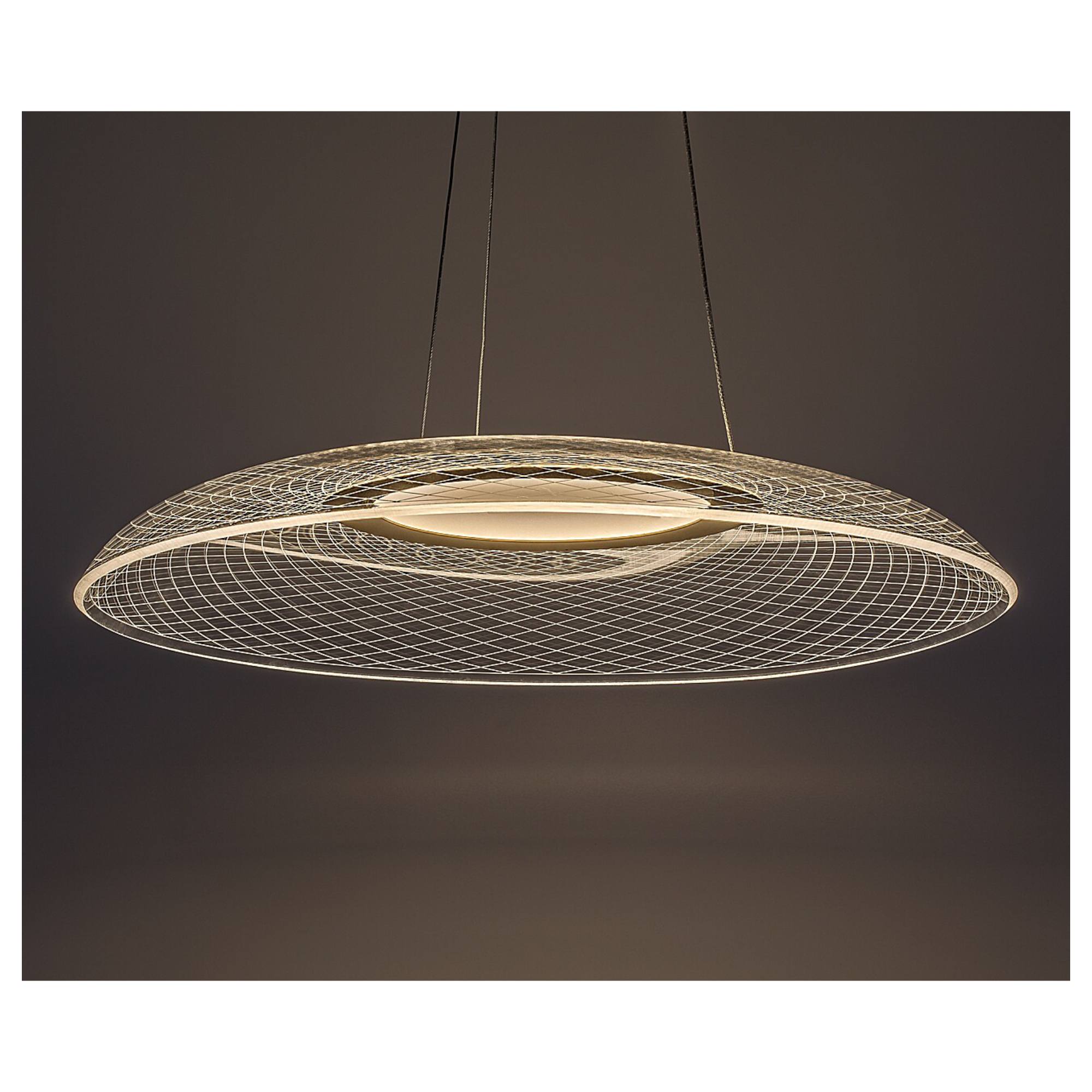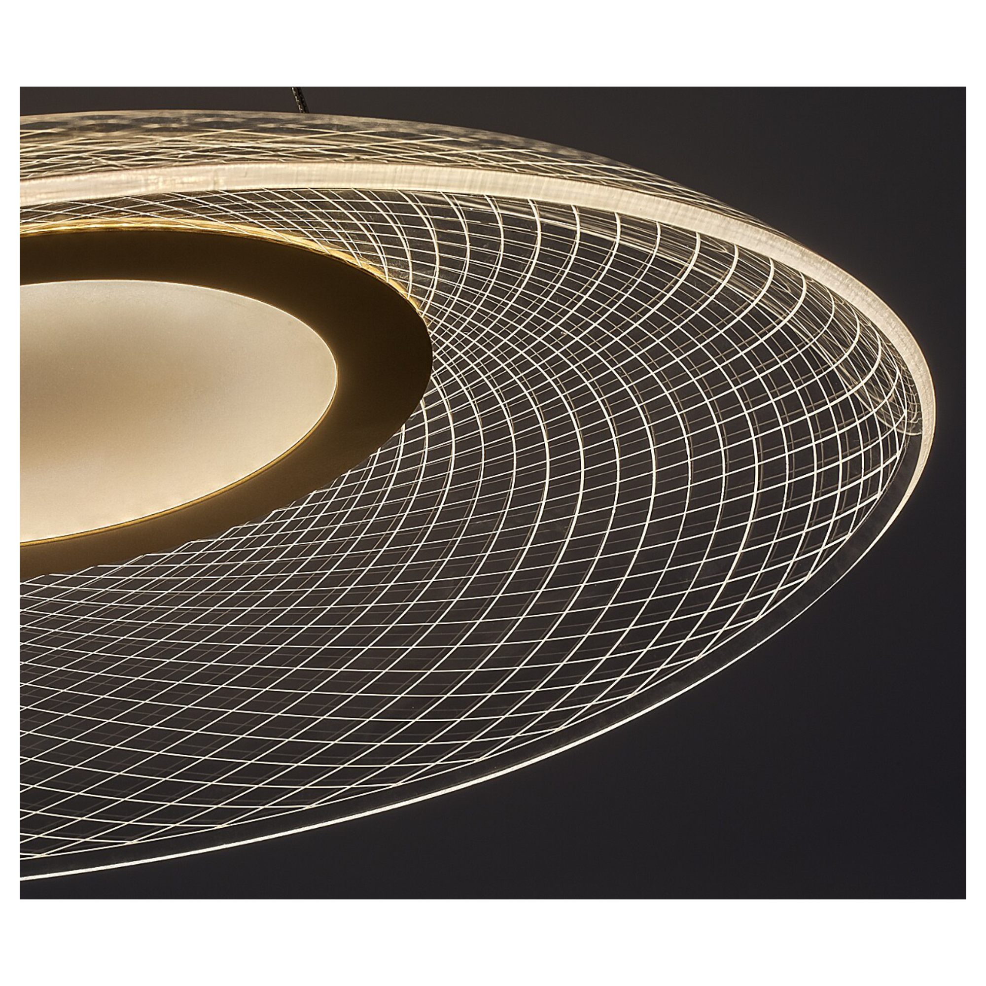 Zaujme na první pohled svým designovým stínidlem, které tvoří dominantní prvek svítidla. Stínidlo je vyrobeno z průhledného akrylu v kruhovém tvaru o průměru 50 cm. Akryl je navíc doplněn jemným vzorem, jež vytváří příjemné atmosférické osvětlení. Elegantním doplňkem je zlatý kovový kruh ve středu svítidla. Stínidlo je k jednoduché konstrukci upevněno pomocí kovových lanek. Bude ideálním osvětlením nad konferenční či jídelní stůl.