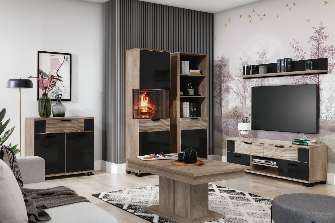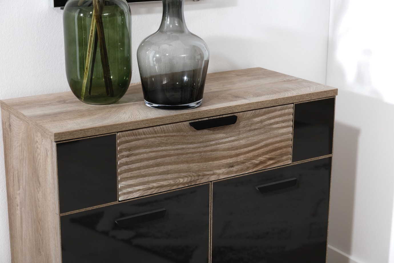 Stylový, moderní, praktický – to jsou tři stěžejní přednosti série produktů GOGER. Vyrobený je z laminovaného dřevěného materiálu. Povrchová úprava ve vysokém lesku v kontrastu s přírodním odstínem a výraznou kresbou dřeva pak utváří moderní útulný interiér. Manipulaci s nábytkem navíc usnadňují praktické úchyty.