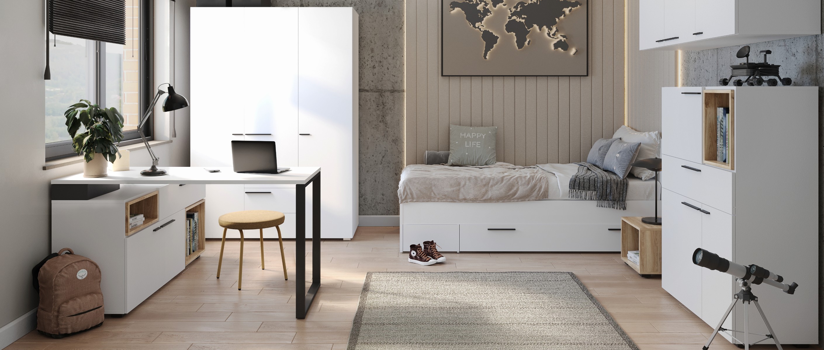 Série produktů MARLOW zajistí dětem zázemí, ve kterém bude radost trávit čas. Nábytek je vyrobený z odolného, dobře udržovatelného lamina. Barevné provedení v neutrální bílé – ze které vyčnívají kontrastní černé úchyty – s otevřeným úložným prostorem v dekoru dubu castello dá vzniknout modernímu pokoji pro kluky i holky.