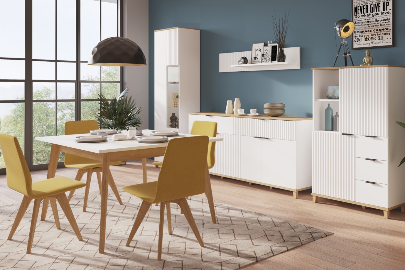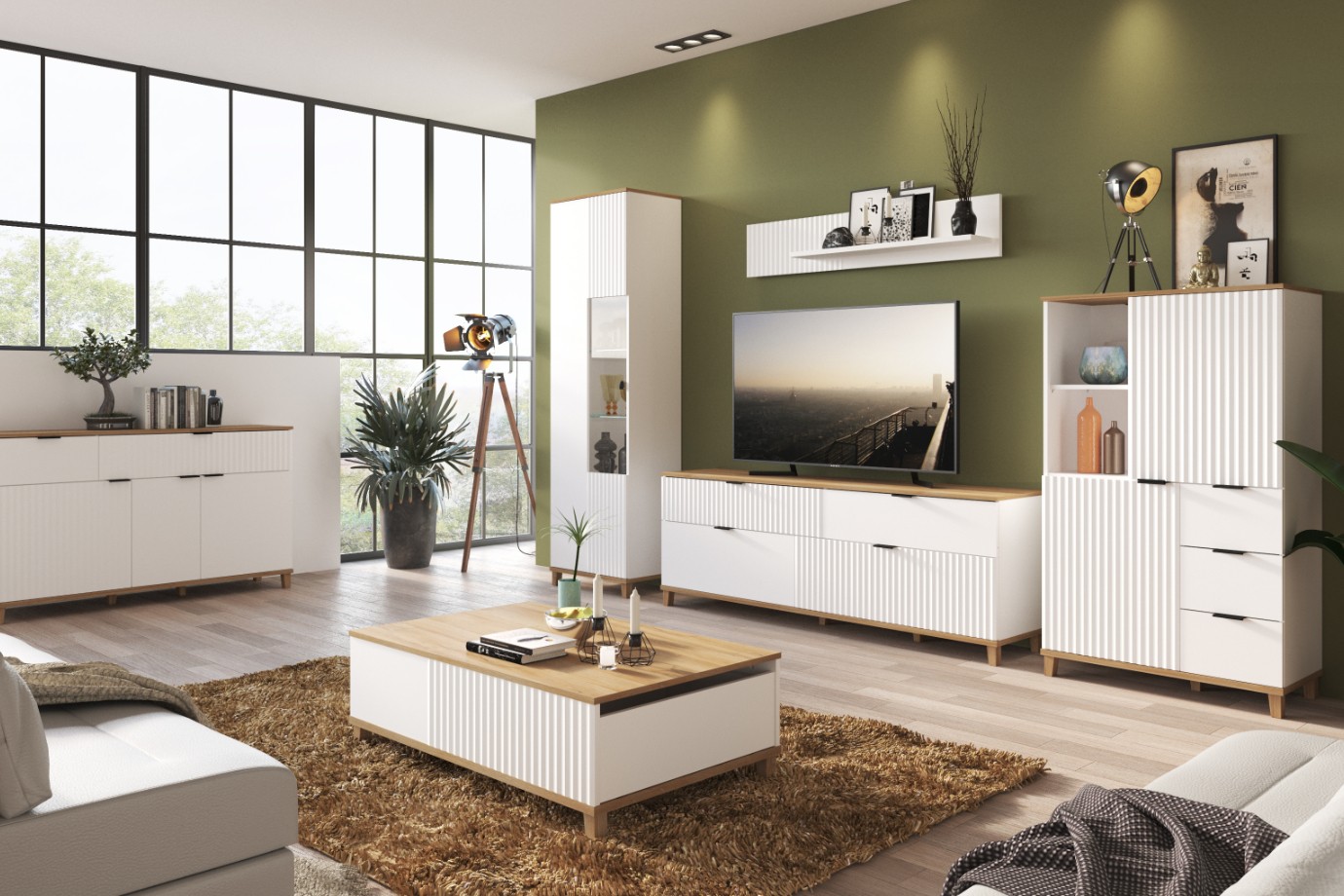 Minimalistický, zároveň však moderní. Série produktů PLISSEE dovede vzhled obývacího pokoje nebo jídelny k dokonalosti. Jednotlivé kusy jsou vyrobené v kombinaci laminovaného dřevěného materiálu a dřevovláknitých desek MDF, které se vyznačují snadnou udržovatelností i dlouhou životností. Manipulaci s nábytkem navíc usnadňují kovové úchyty a tiché dovírání dvířek a zásuvek – ty jsou opatřeny dekorativním pruhovým frézováním. Alpský odstín bílé pak domácnost projasní a v kontrastní kombinaci s dekorem dřeva dubu grandson jí dodá styl a útulno.