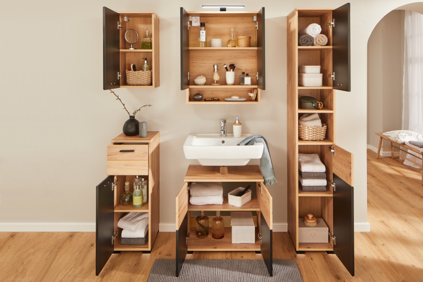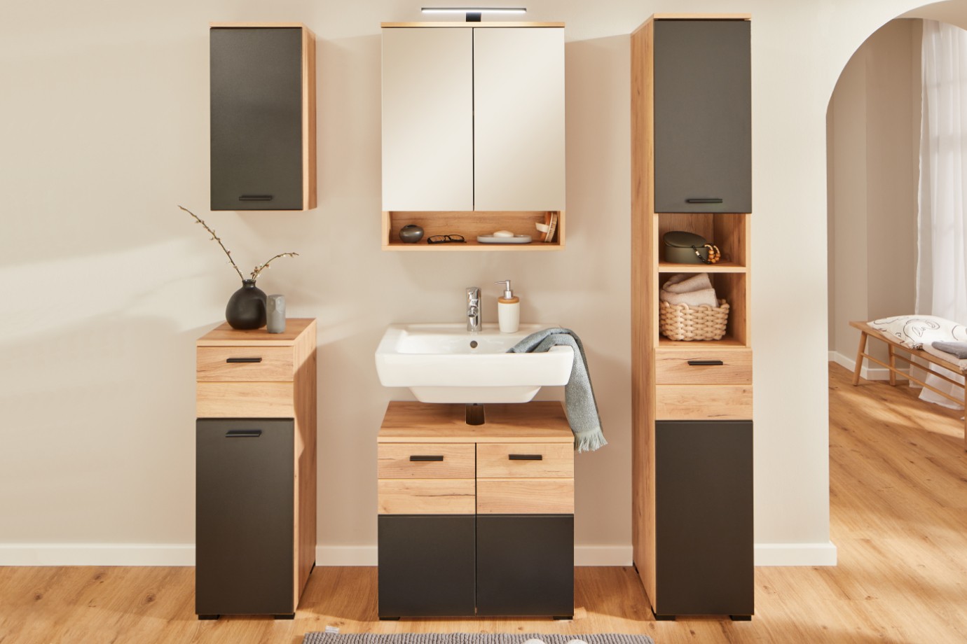 Centrum hygieny, očisty, pohody i odpočinku – tím vším je každá koupelna. Stejně jako obývák, ložnice nebo jídelna si i koupelna zaslouží útulný funkční nábytek. Série produktů RIOM ze snadno udržovatelného lamina nabízí moderní design v kontrastním barevném provedení matné černé s dekorem dubu artisan, poskytuje dostatek úložného prostoru a místnosti propůjčí osobitý přírodní vzhled, který utváří útulnou a klidnou atmosféru.